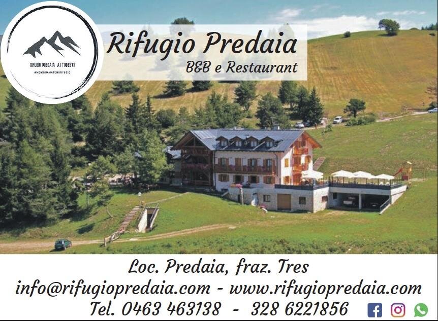 Préerie na Predaie měly hojnou trávu, i pro některé zemědělce z Jižního Tyrolska, tedy „Tedesky“. Takto je vysvětlen historický název této chaty, který by byl v jazyce Tedešů „Predaia“, a která dominuje údolí Non s výhledem na stěny Brenty, kde slunce zapadá. Chata je otevřená po celý rok: v zimě si užijete sněhové radovánky se sáňkami, sněžnicemi nebo běžkami; v létě si děti hrají na loukách (a na malém hřišti) a procházejí se po snadných stezkách pěšky, na horském kole nebo na koni. Díky snadnému přístupu (lze se k ní dostat autem) je toto místo také oblíbeným cílem pro ty, kteří chtějí oslavit u stolu v dobré společnosti. Otevírací doba Otevřeno po celý rok Před výletem se doporučuje ověřit skutečnou otevírací dobu chaty kontaktováním provozovatele Trasy Od chaty Predaia se za přibližně 2 hodiny chůze dostanete na Corno di Tres, což je impozantní vyhlídka na údolí Adige a mnoho vrcholů Trentina (obtížnost E). Na Malga Nuova di Coredo se dostanete za pouhou 1 hodinu chůze (obtížnost E).