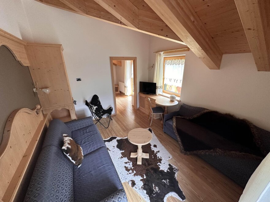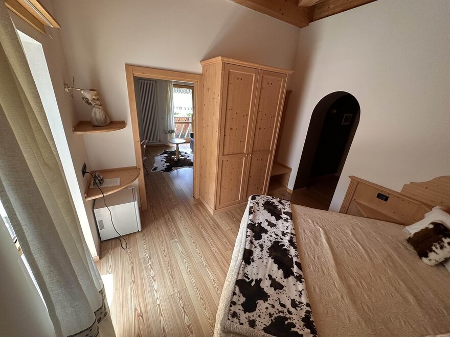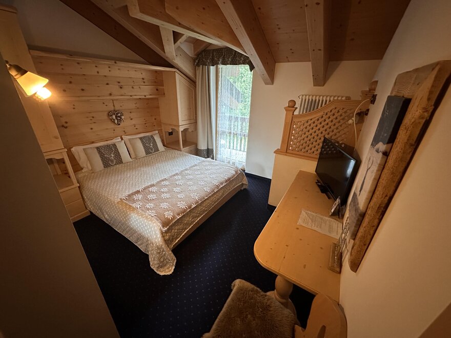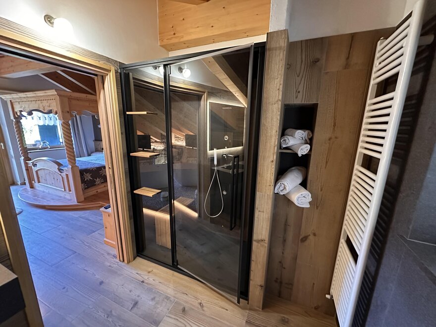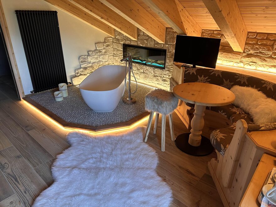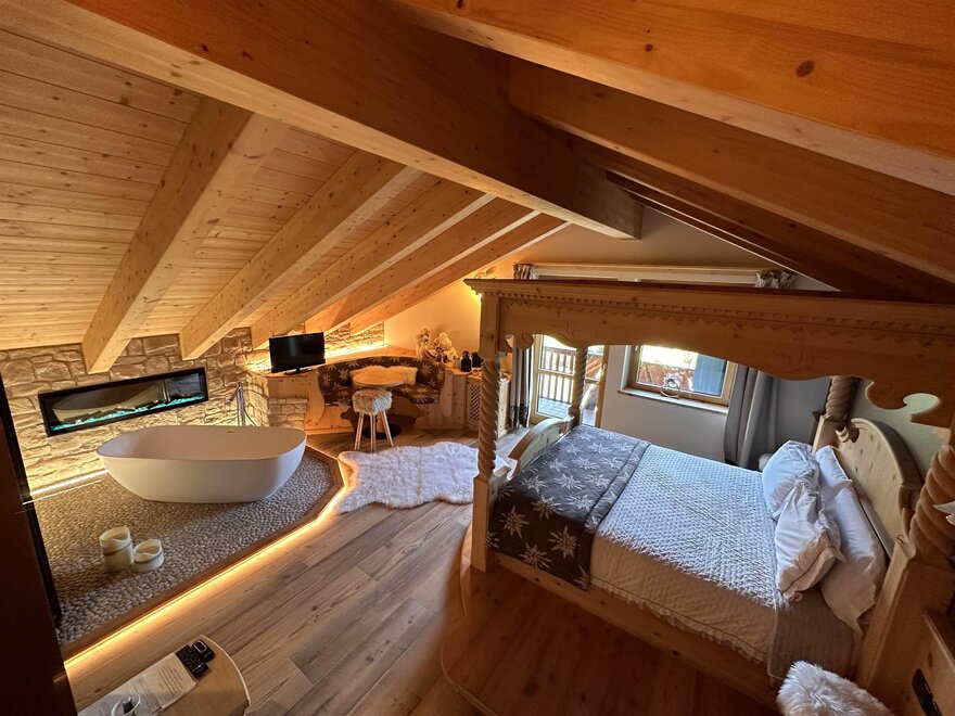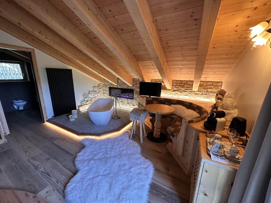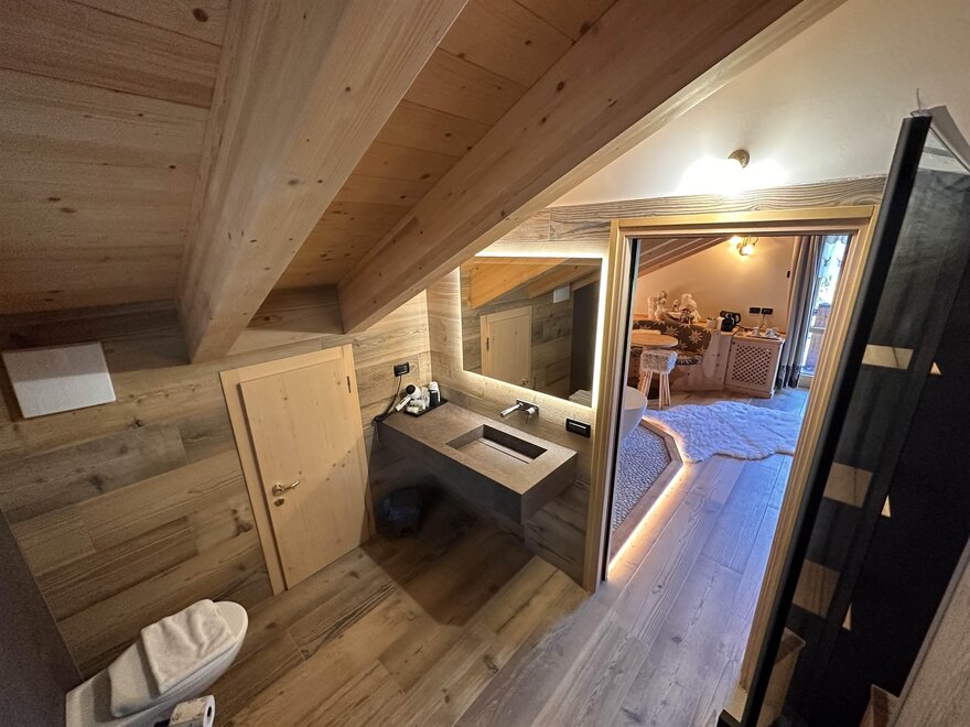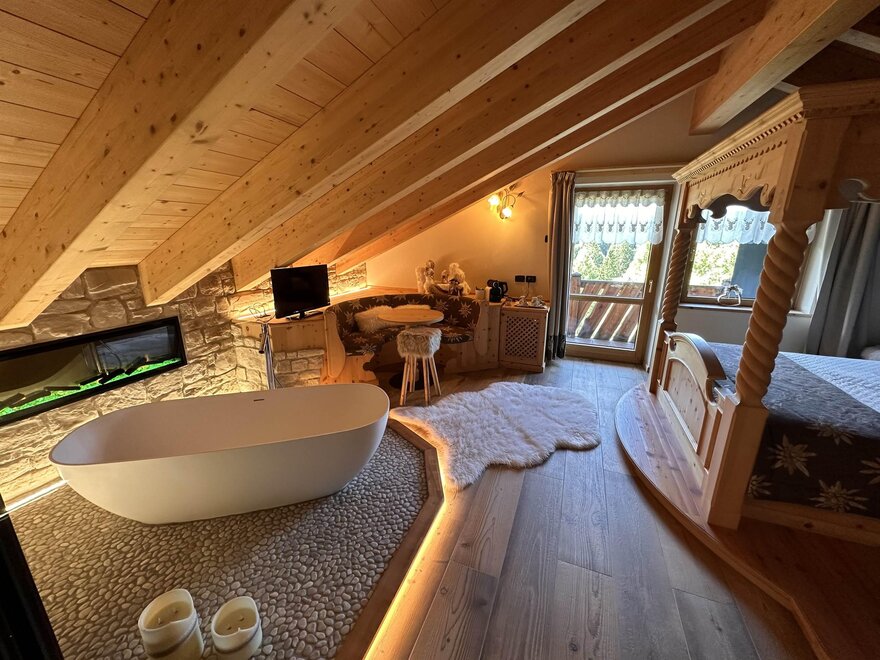 Pokoj o rozloze 40 m², mansardový, s nebesy, zařízený cenným dřevem ze smrku cirmolu z Trentina. Dřevo cirmolu je typická rostlina alpských oblastí, roste pouze nad 1200 metrů nad mořem a je nazýváno "stromem spánku" pro své vysoce relaxační vlastnosti, které dokážou zlepšit cirkulaci a regulovat srdeční tep. Jeho vůně je skutečně zázračná pro dýchací cesty, s prospěšnými, terapeutickými a antibakteriálními vlastnostmi. Dřevěná podlaha, obývací kout, TV, lednička, relaxační koutek s vanou a krbem na pokoji, měkké župany, pantofle, varná konvice s bylinkovými čaji, výběr polštářů včetně polštáře cirmolu, sprchový kout HAMMAN, vodopád, parní lázeň, aromaterapie, barevná terapie.