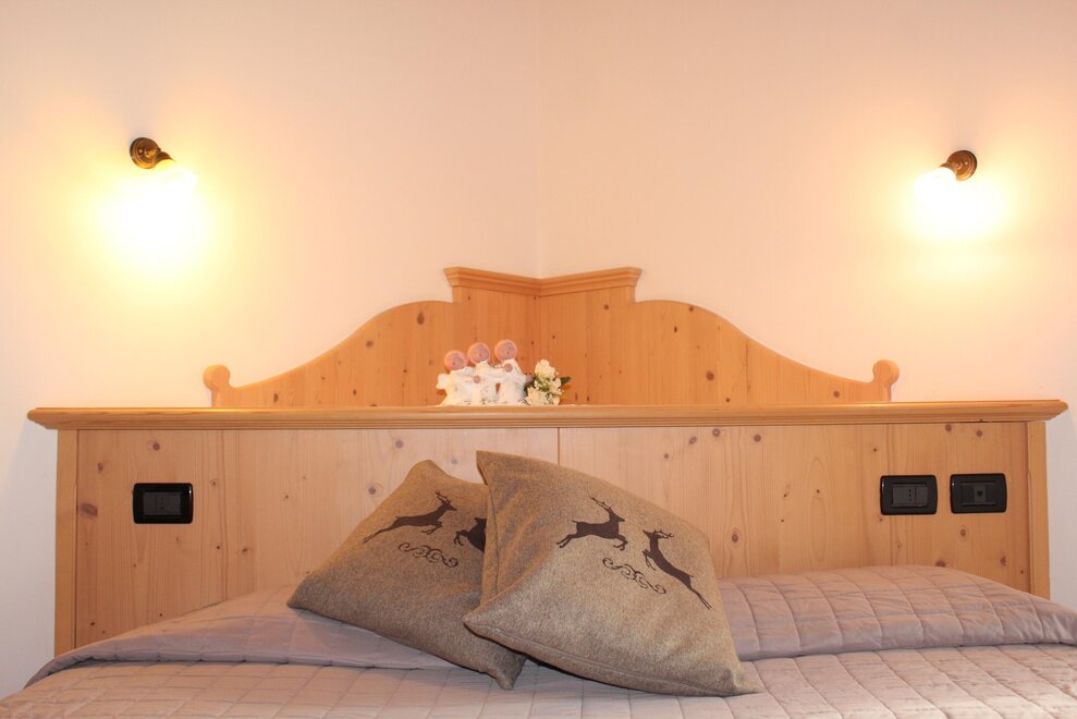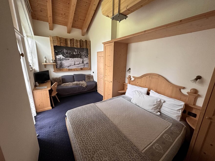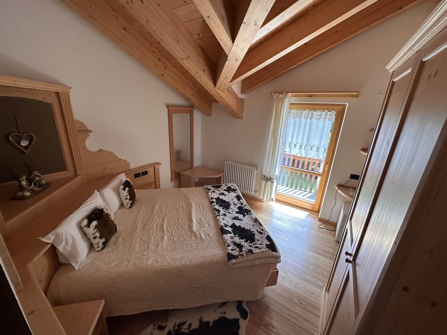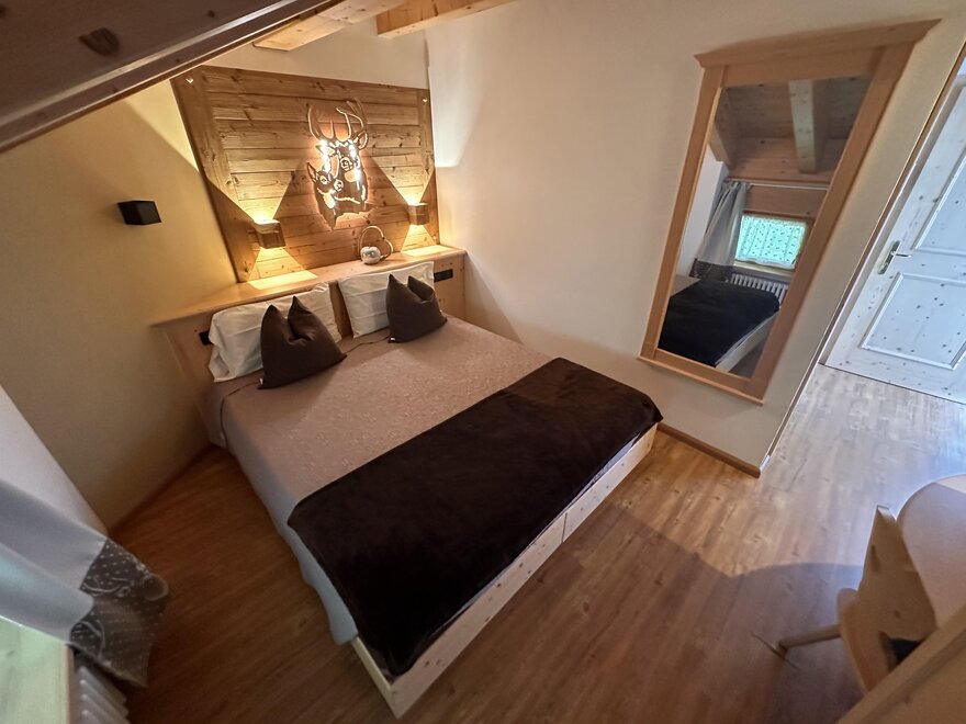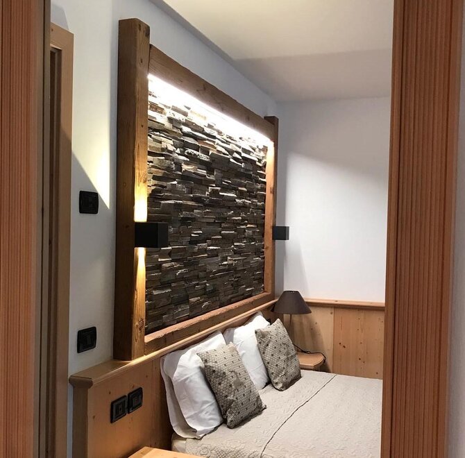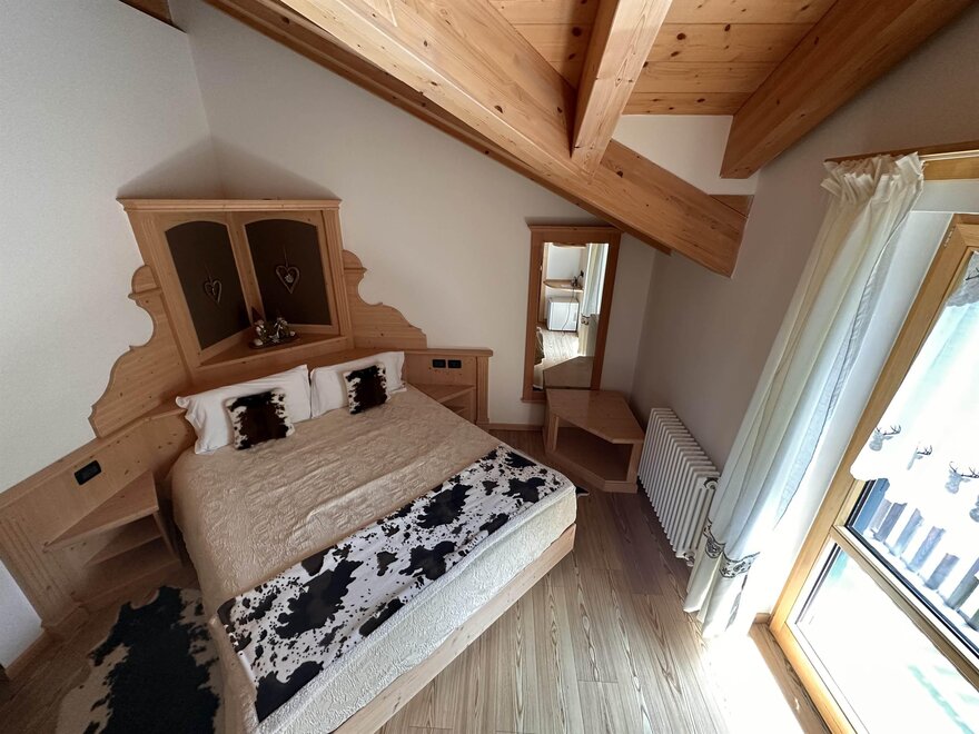 ložnice zařízené v typickém dřevě, aby přenesly pocit pohody a skutečného pobytu na horách...