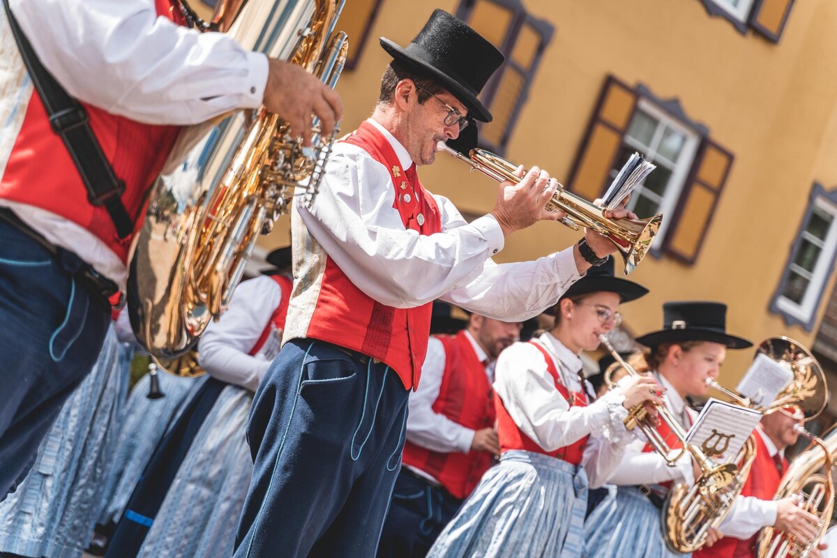 Die Musikkapelle von Moena zieht durch die Dorfstraße, begleitet von der Volkstanzgruppe von Soraga, und tritt vor dem vor dem Touristinformationsbüro auf