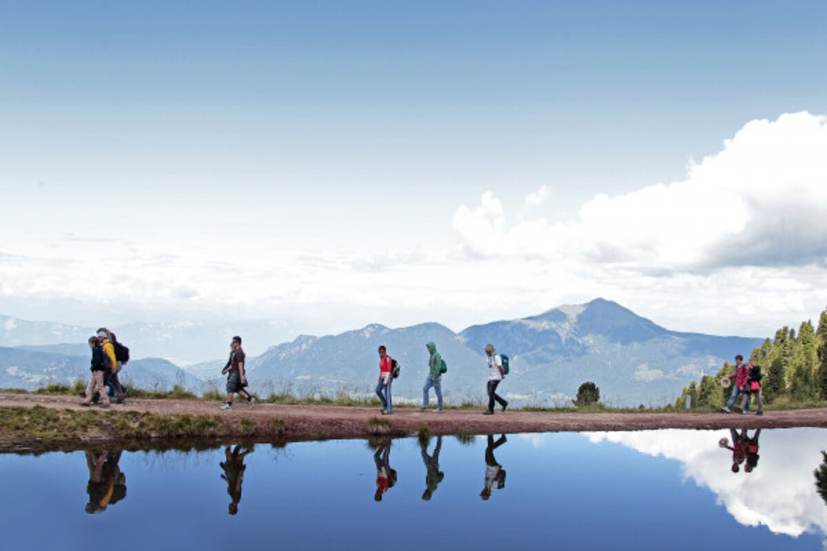 Reiseplan: 2 Seilbahnstrecken von Cavalese zur Alpe Cermis und dann mit dem Sessellift nach Paion. Der Weg Nr. 8 führt zum Tò della Trappola mit Blick auf die Bombasel Seen, den man erreicht, indem man den langen und aussichtsreichen Kamm des Castel di Bombasel überquert.