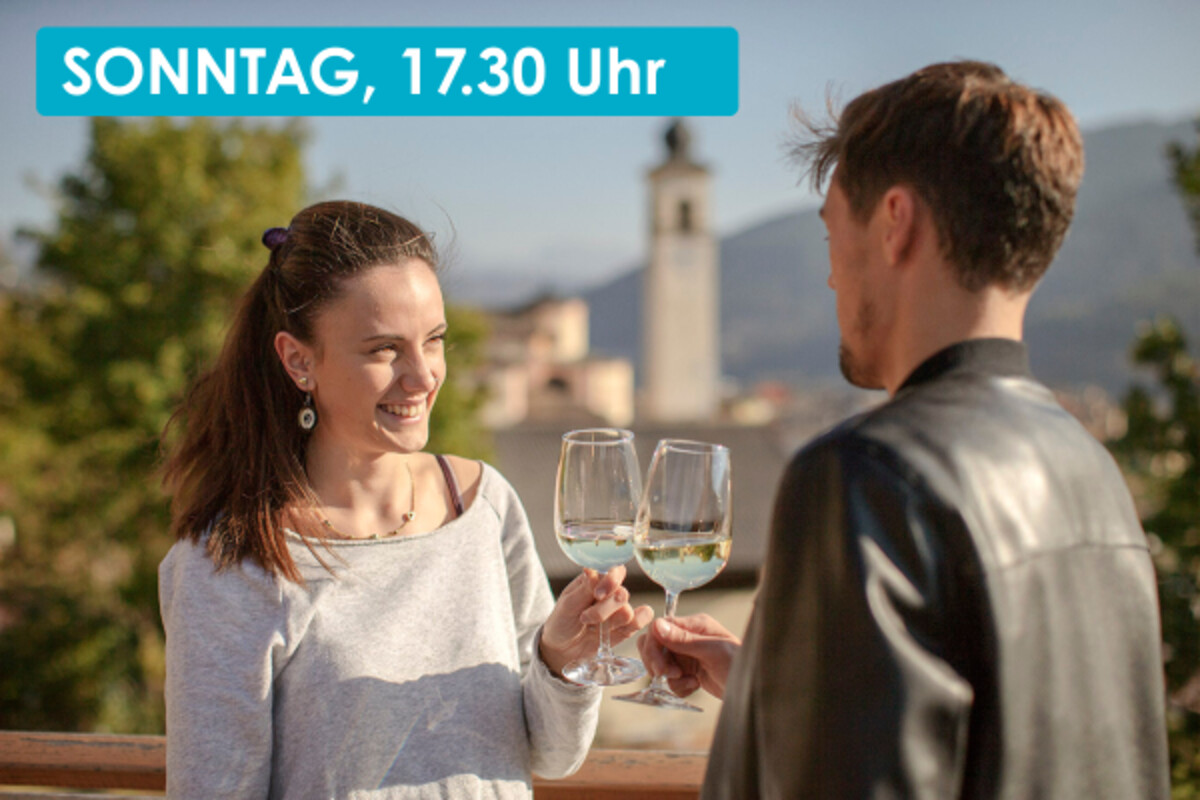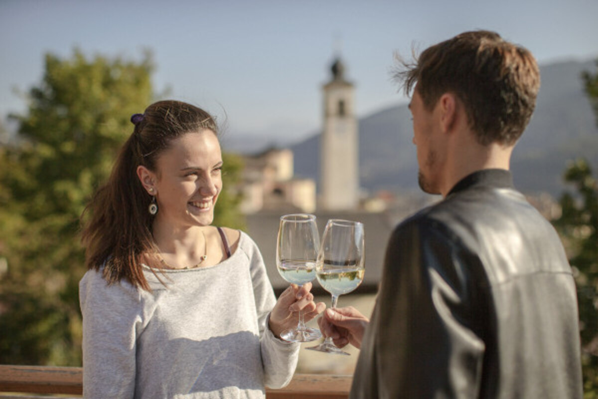 Auf der Panoramaterrasse erwartet uns ein Null-Kilometer-Aperitif mit Spezialitäten aus dem Cembra-Tal, ...