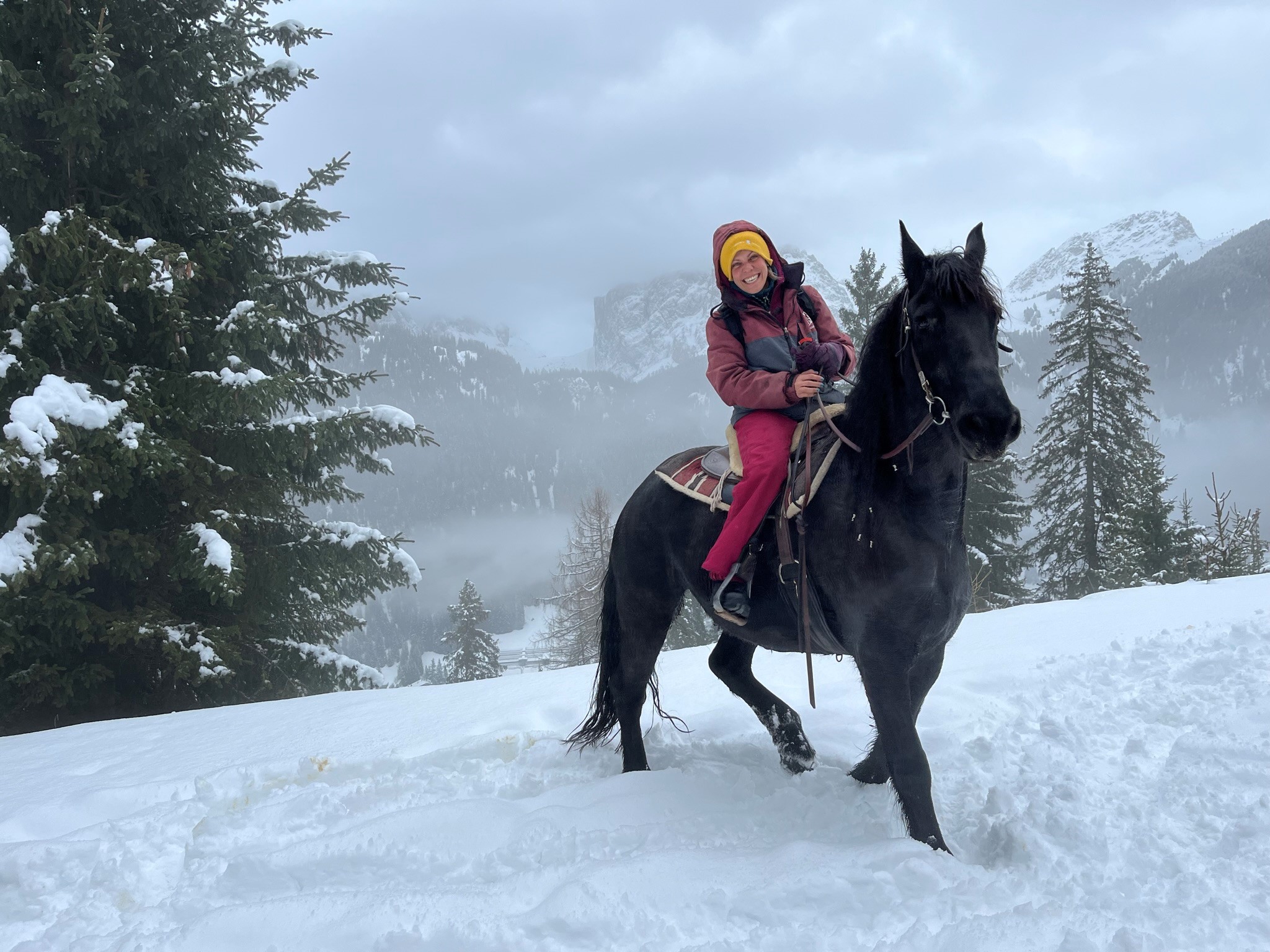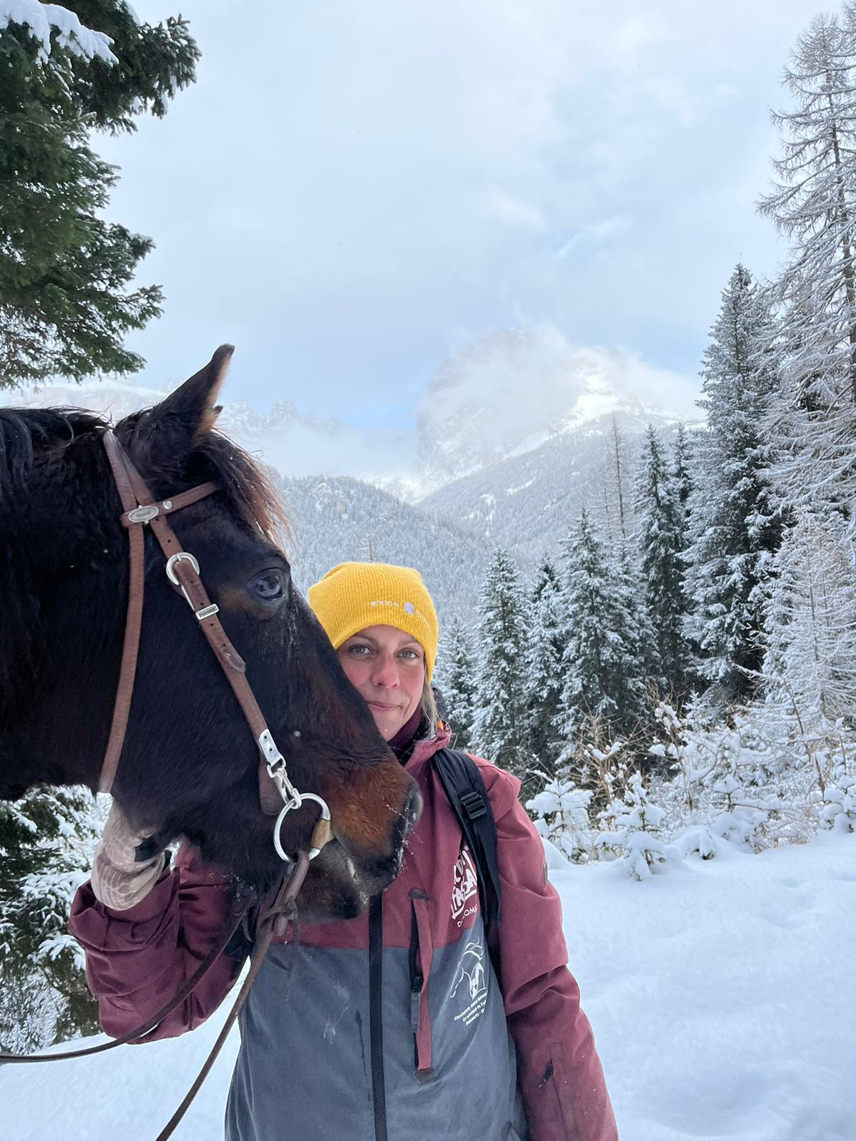 So kam sie 2016 ins Trentino und eröffnete einen Reitstall in Campitello di Fassa, in dem sie traumatisierte Pferde behandelt. Von hier aus starten auch die Reitausflüge, hier, in der vertrauten Umgebung des Tieres kann die Annäherung zwischen Mensch und Pferd leichter erfolgen. Zusätzlich bietet Carlotta aber auch als eine der wenigen Reitlehrerinnen der Region das Equestrian Ski Dragging oder Skijoring an. Dabei handelt es sich um einen Wintersport, bei dem ein Ski- oder Snowboardfahrer von einem Pferd über bestimmte Hindernisse gezogen wird. Dabei scheinen beide, Tier und Sportler, jede Menge Spaß zu haben.