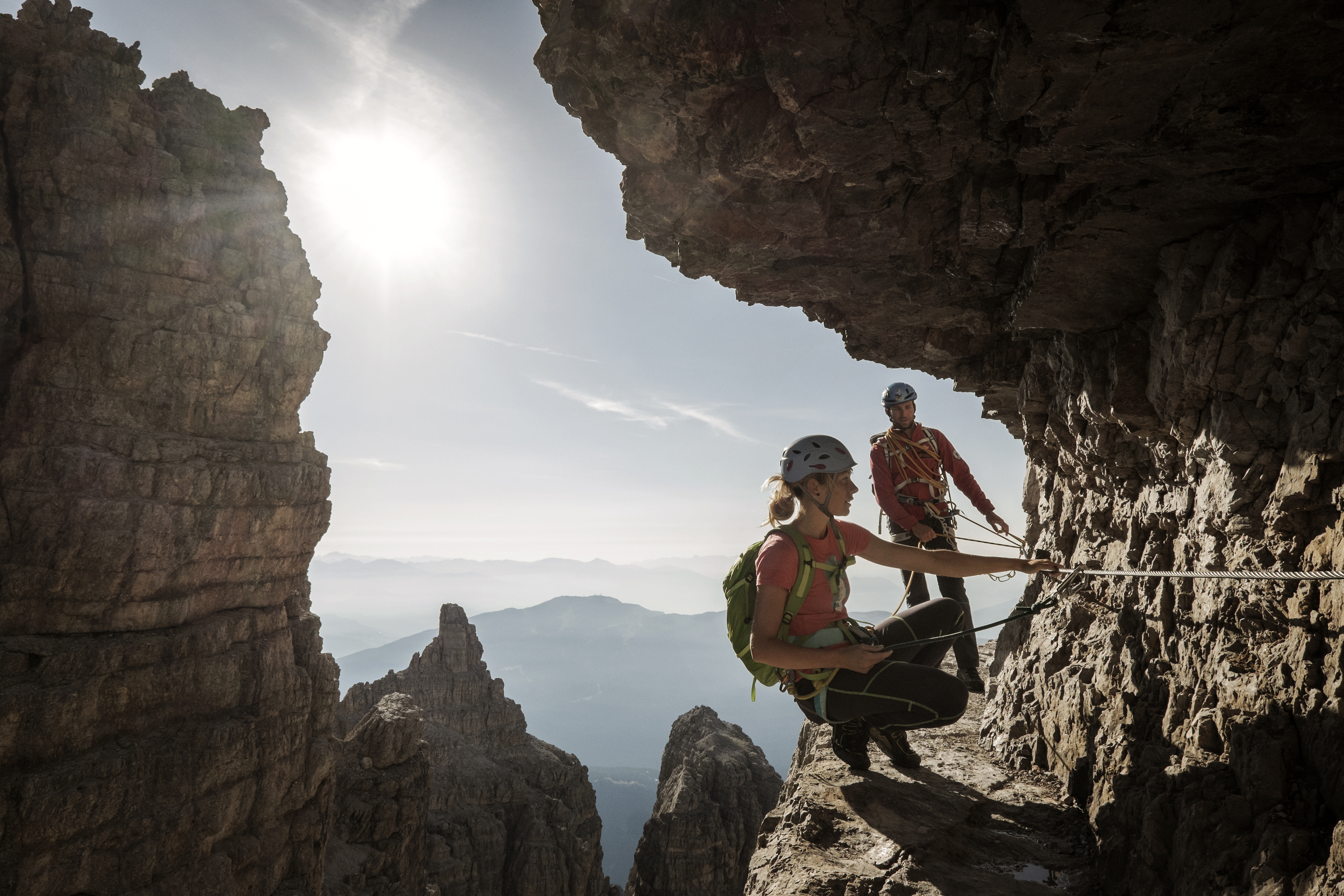 Die Via delle Bocchette ist ein Klassiker unter den Höhenwegen der Alpen und zählt mit seinen Strecken durch die Brenta-Dolomiten zu den besten Klettersteigen Europas. Kein Wunder, denn das Wegenetz führt auf über 3.000 Metern Höhe über schmale Felsbänder, entlang gähnender Abgründe, über schroffe Felsen auf luftigen Leitern und ermöglicht erfahrenen Kletterern atemberaubende Tiefblicke und Fernsichten.