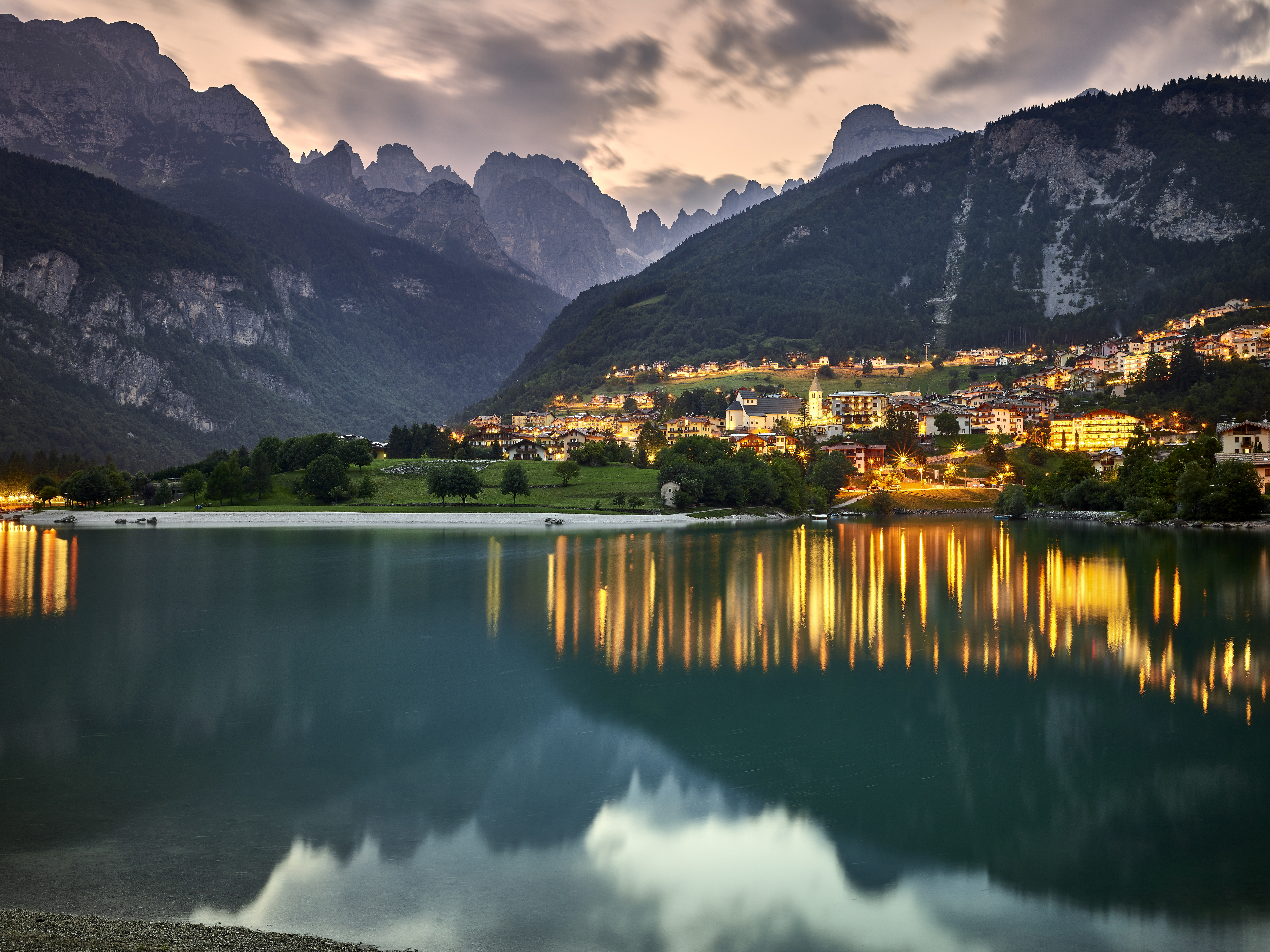 Vom Reiseführer „Il Mare più bello 2021“ als schönster See Italiens ausgezeichnet, gilt der Lago di Molveno längst nicht mehr als Geheimtipp. 12 Kilometer lange Wanderstrecken führen direkt am Ufer entlang. Dabei offenbaren sich dichte Wälder, verlassene Buchten und Ehrfurcht gebietende Klippen. Der 12 Hektar große Sandstrand vereint die Sicht auf die in den See reichende Halbinsel am Westufer und das Bergpanorama der majestätischen Brenta-Gruppe.