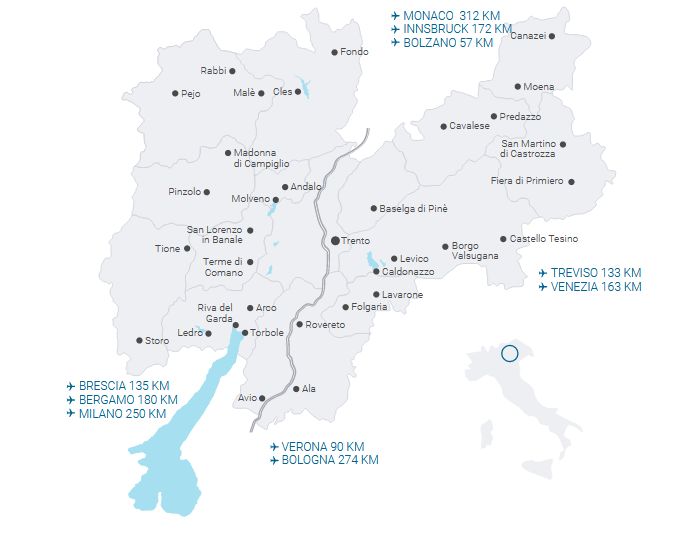 Der Flughafen in Verona liegt etwa 90 km von der Hauptstadt Trento entfernt, Bergamo 135 km, Venezia 163 km und Milano 250 km. Von dort ist das Trentino in ein bis zwei Stunden mit dem Mietwagen, dem Pendelbus oder der Bahn erreichbar.