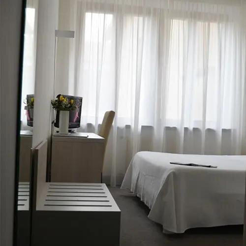 Einzelzimmer mit Blick auf unseren ruhigen Innenhof mit Parkettboden. Anstelle eines Einzelbetts sind die Zimmer mit einem 120 cm breiten Bett für mehr Komfort in der Nacht ausgestattet.