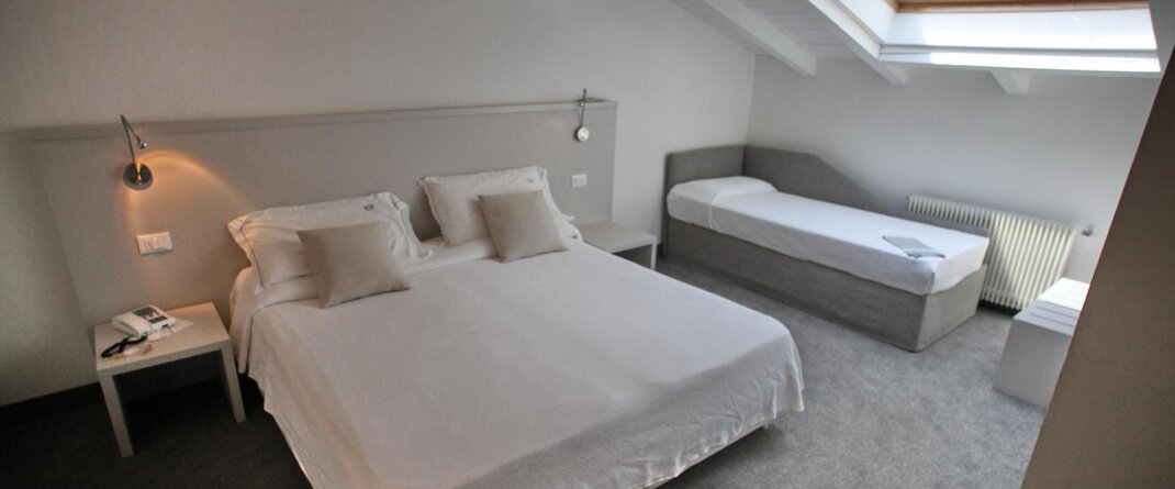 Ein Zimmer mit Doppelbett und Teppichboden, das sich durch mehr Platz als die klassischen Zimmer auszeichnet, von denen sich einige im Dachgeschoss befinden.