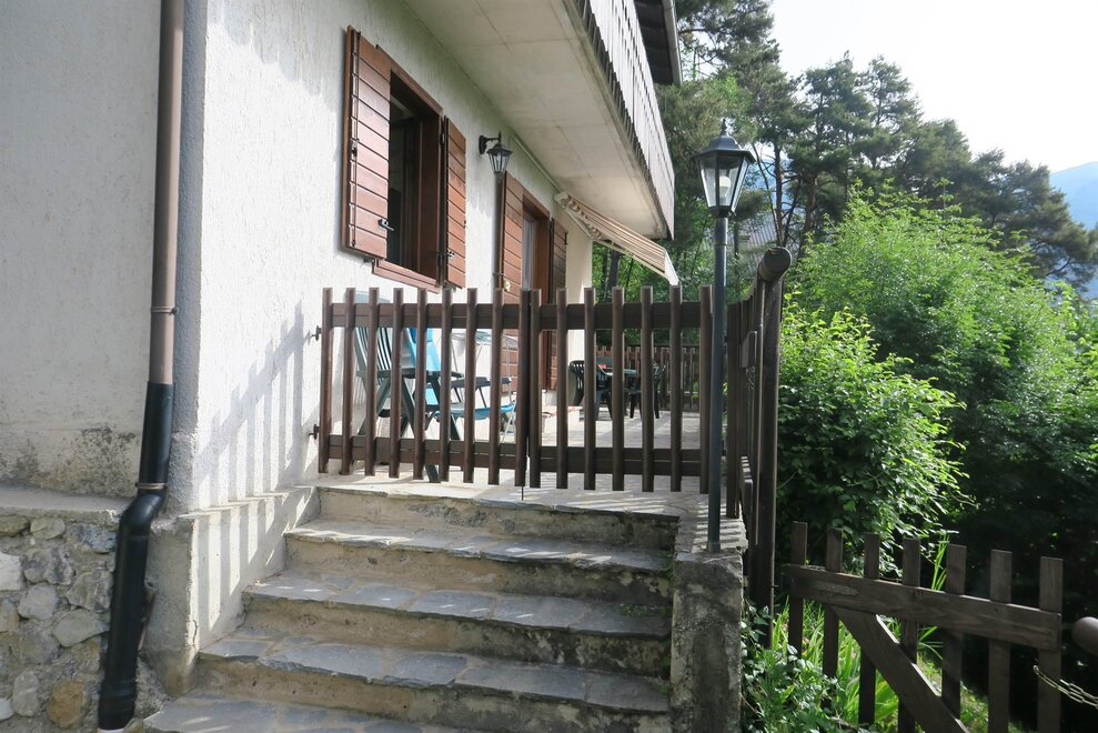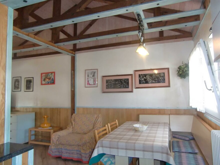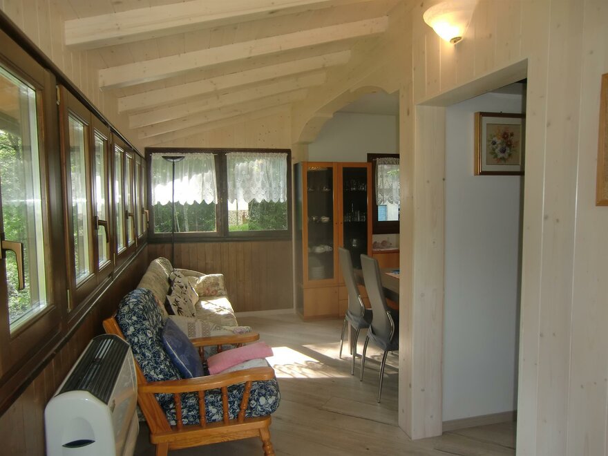 Über die interne Holztreppe gelangt man in den ersten Stock, in welchem sich eine geräumige Küche, eine Veranda als Aufenthaltsraum, ein Wohnzimmer mit Sofa und TV, ein Schlafzimmer mit Doppelbett und ein Schlafzimmer mit zwei Einzelbett.