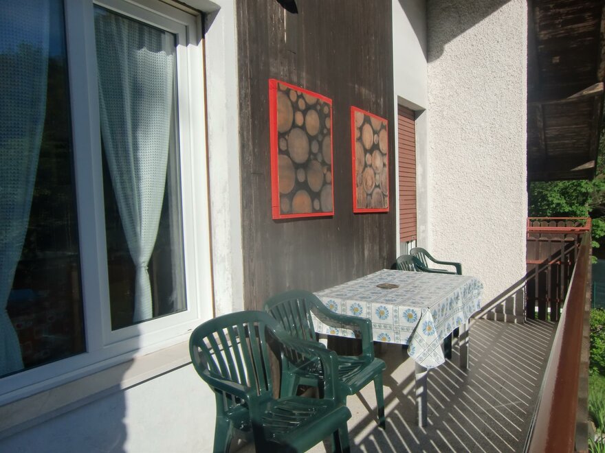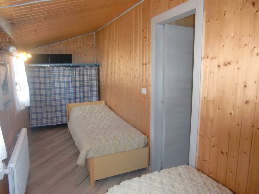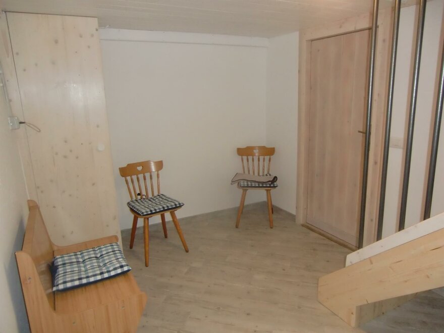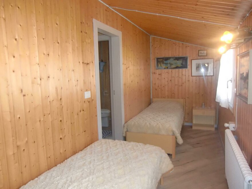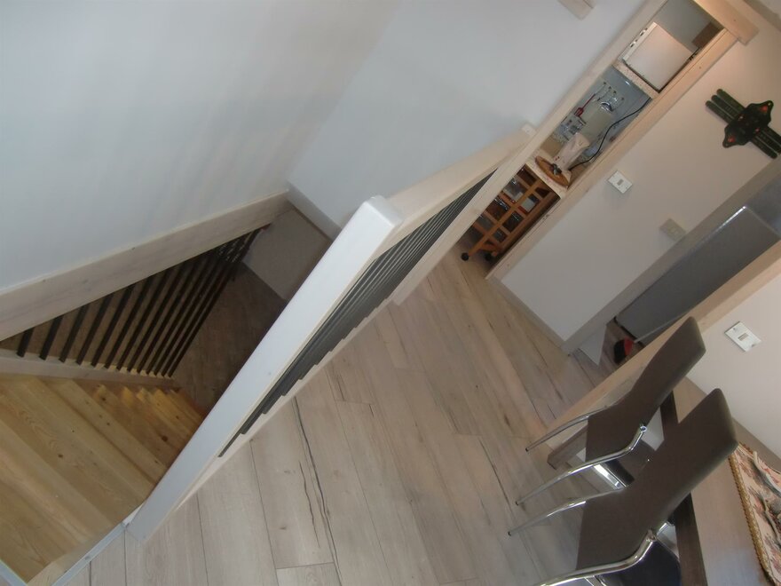 Über die interne Holztreppe gelangt man in den ersten Stock, in welchem sich eine geräumige Küche inklusive elektrischer Haushaltsgeräte befindet, eine Veranda als Aufenthaltsraum, Wohnzimmer mit Sofa und TV, ein Schlafzimmer mit Doppelbett und ein mit zwei Einzelbett.