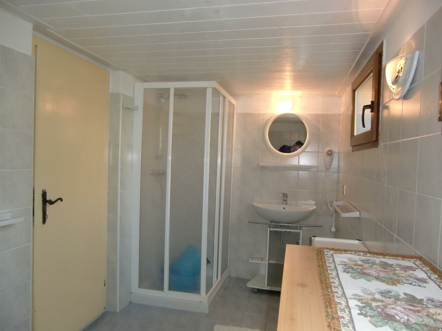 Ebenfalls im Erdgeschoss befindet sich das grosse Badezimmer mit Duschkabine, Toilette und Badewanne.