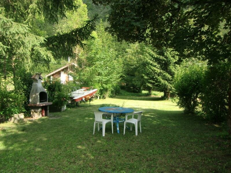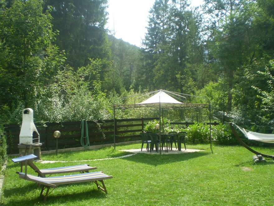 Der Garten des Hauses ist mit Pavillon, Tisch, Bänken, Liegestühlen, Grill und Ecke aromatischer