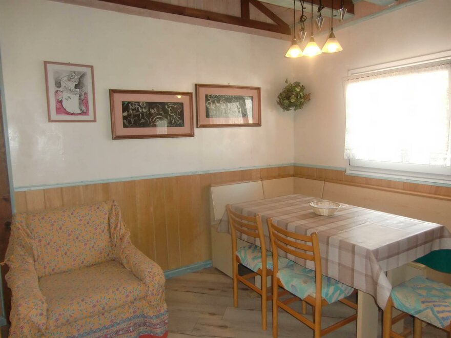 Das Haus ist in zwei Stockwerke aufgeteilt: das Erdgeschoss (gemauert) beinhaltet: Wohnzimmer mit Couch, Sessel, Kamin für Holzfeuer, Tisch mit Stühlen und Satelliten TV.