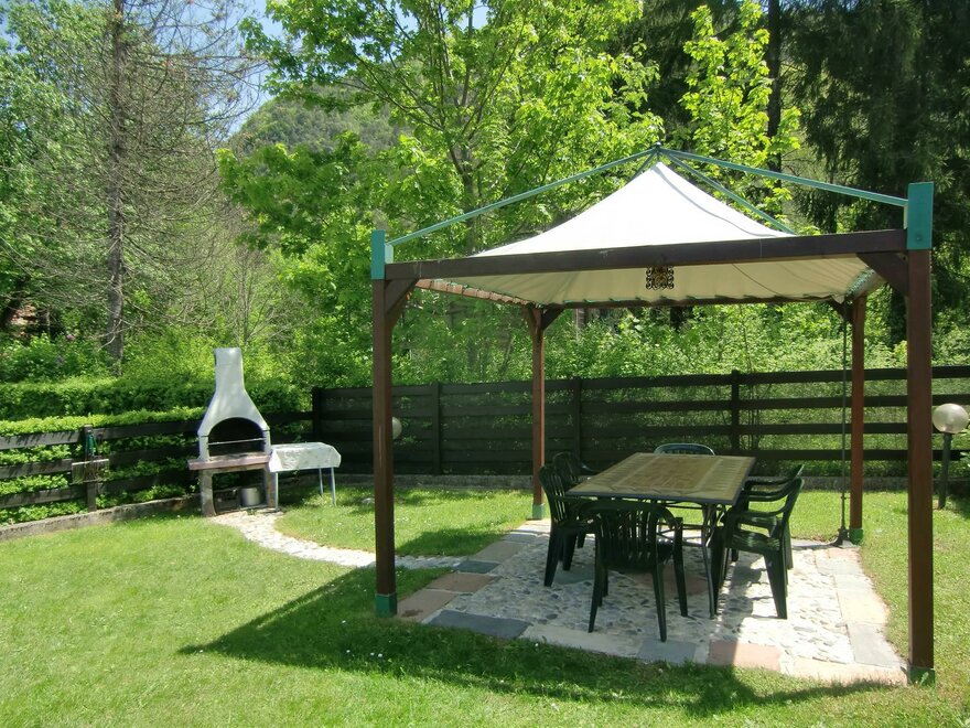 Im Garten gibt es eine Holzpergola mit Grillplatz, Tisch und Holzbänken.