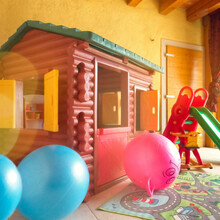 Die Struktur verfügt über zwei Spielbereiche für Kinder (einen externen und einen internen), Gemeinschaftsbereiche (intern und extern), einen ausgestatteten Garten, Zugang zur Landschaft und zum Gewächshaus.