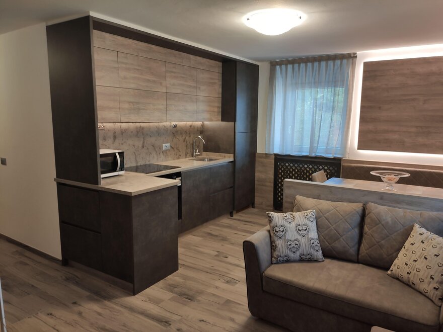 Geschirr vorhanden, Geschirrspülbecken, Elektroherd, Tisch- und Küchenwäsche, Heizung, Waschmaschinenbenutzung, Decken, Balkon, Garten, Kühlschrank, Haarföhn, Ruhiges Zimmer/Appartement, Fernseher, Bügeleisen, Mikrowelle, Separate Küche, Küche, Separate Schlafzimmer: 2