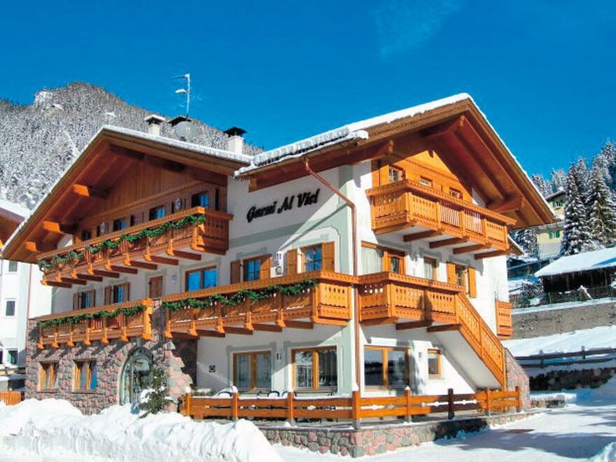 Das Garni Hotel Al Viel der Familie Bernard beeindruckt nicht nur mit einer ruhigen und sonnigen Lage, wenige Gehminuten vom Zentrum von Canazei entfernt, sondern auch durch die exklusive Empfangsphilosophie und den Anschluss ans Wanderwegenetz in einer Panoramalandschaft . Der Name "Al Viel" stammt aus dem Ladinischen und bezeichnet einen "Bergweg", deren es zahlreiche rund um unser reizendes Garnì-Hotel gibt. Das Garnì-Hotel Al Viel liegt an einem sanften Hang, mit Blick auf die berühmten Gipfel der Marmolata, des Vernel, der Cirelle, des Monte Colac, des Rosengartens, von Sella und Pordoi und beeindruckt seine Gäste dank der familiären Gastlichkeit, Liebe zur Tradition sowie der vielen Annehmlichkeiten: Fahrstuhl, WLAN, leicht zugänglicher Parkplatz ... B&B inklusives reichhaltiges Frühstücksbuffet! Wir freuen uns, Sie im Al Viel willkommen zu heißen!
