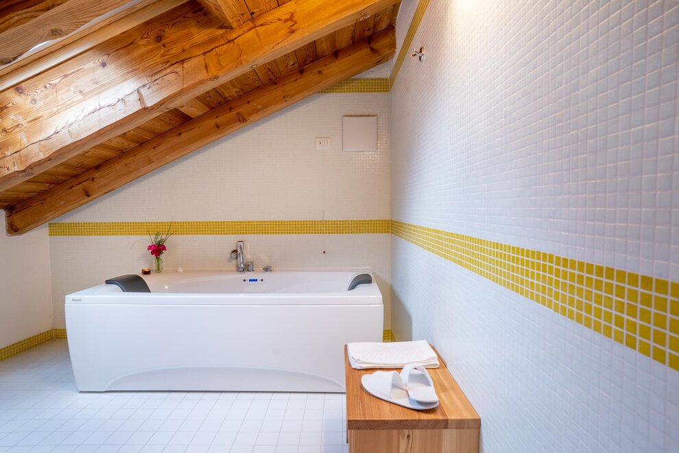 Gästeanzahl 3. Befindet sich im Dachgeschoss. Größe 37 m². Holzböden. Doppelbett (180x200 cm), teilbar in zwei Einzelbetten, Schlafsessel für 1 Person (80x200 cm). Whirlpool im Zimmer, Bad mit Doppelwaschbecken, Dusche. Kleiner Balkon mit Tisch und Stuhl. Biologische Pflegeprodukte. TV. WLAN. Minibar. Schreibtisch. Safe.