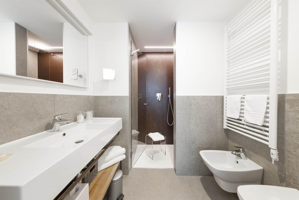 Diese moderne und stilvolle Suite punktet mit hochwertigem Interieur aus Eichenholz und Platten aus Keramik-Feinsteinzeug mit Porzellanoptik. Die großzügige Terrasse (nach Süden ausgerichtet) lässt die Schönheit der Natur ins Innere dringen und verspricht Landschaftskino vom Feinsten.