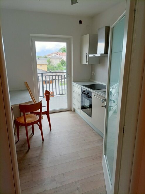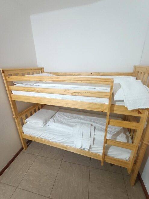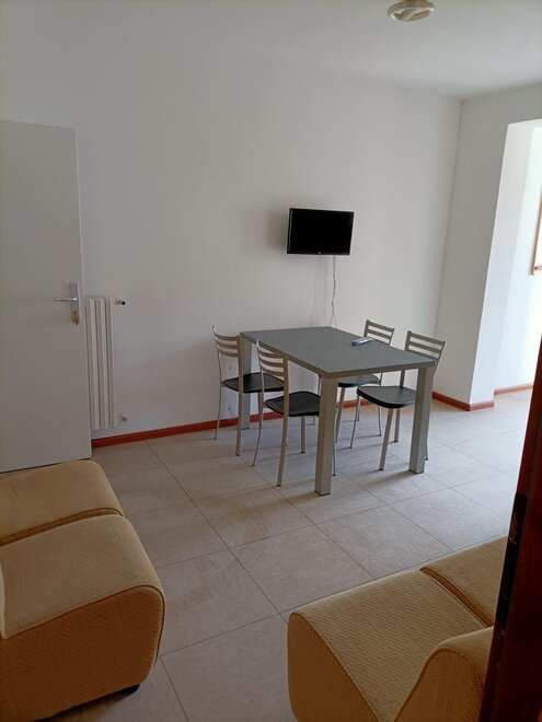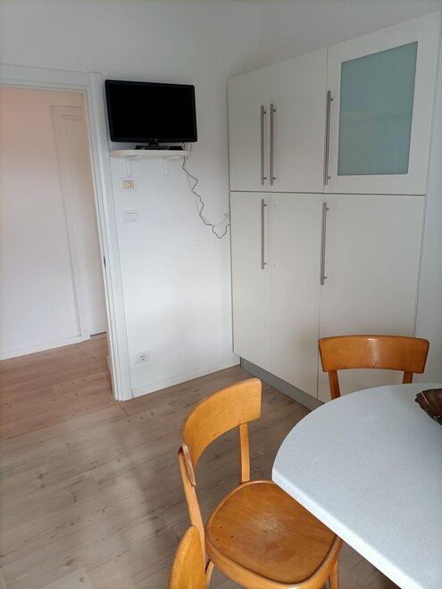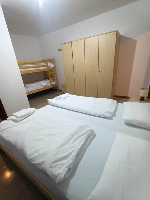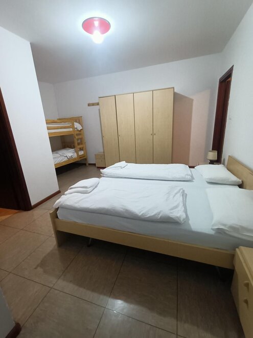 Familienfreundliche Zweizimmerwohnung, bestehend aus einem geräumigen Familienzimmer mit Doppelbett und Etagenbett. Wohnbereich mit Balkon. Kochnische ausgestattet mit Induktionskochfeld, Dunstabzugshaube, Kühlschrank und Geschirr.