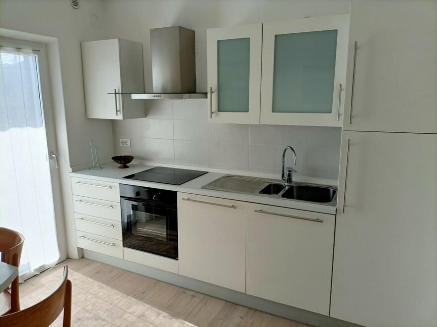 Wohnung im dritten Stock, komplett modern renoviert. Doppelt Balkon, einer nach Süden mit Ausgang vom Schlafzimmer, der andere nach Westen, mit Ausgang von der Küche, und die Möglichkeit, draußen zu essen. Geräumiges Schlafzimmer mit einem französischen Bett.