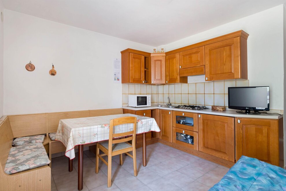 Die Wohnung besteht aus: Küche - Wohnzimmer mit Sofa, 2 Schlafzimmer (ein Schlafzimmer mit zwei nicht zusammenstellbaren Einzelbetten, das andere mit drei Einzelbetten, von denen zwei zusammengestellt werden können), ein Badezimmer mit Dusche, Garten.