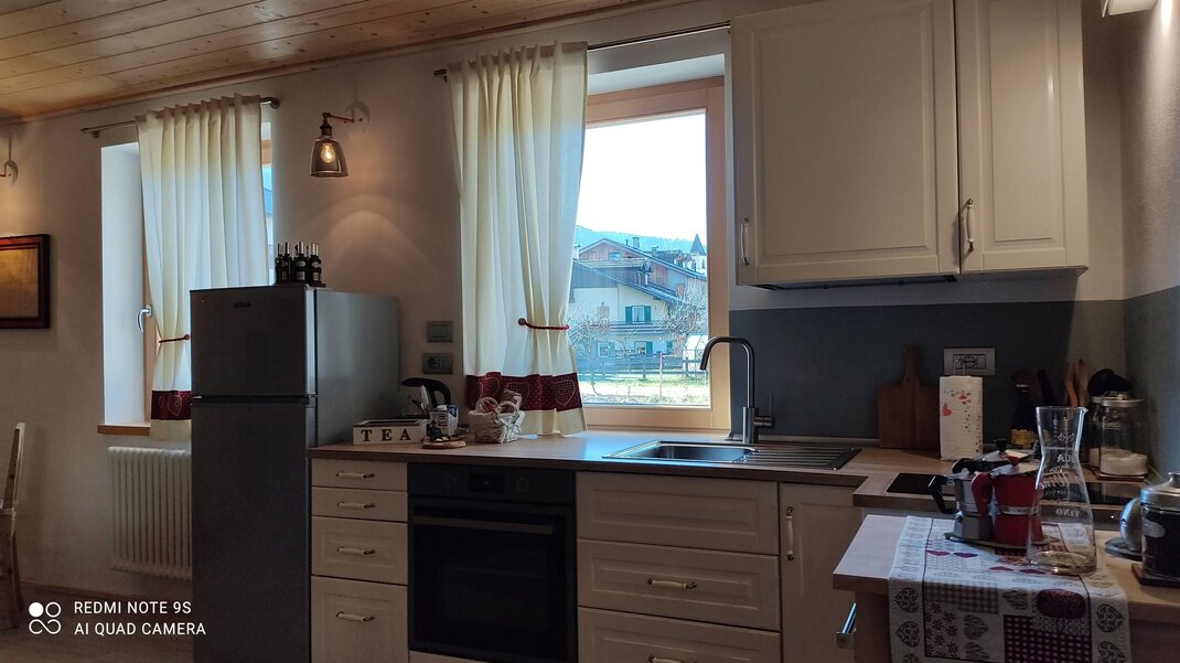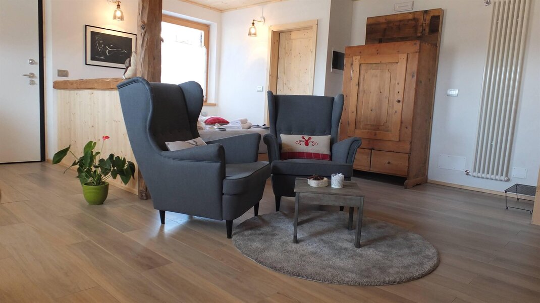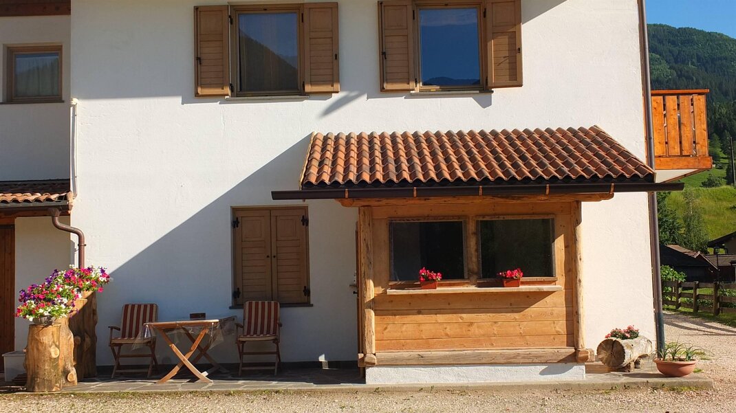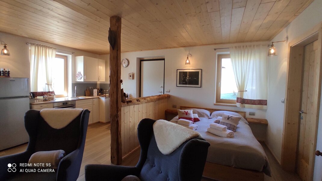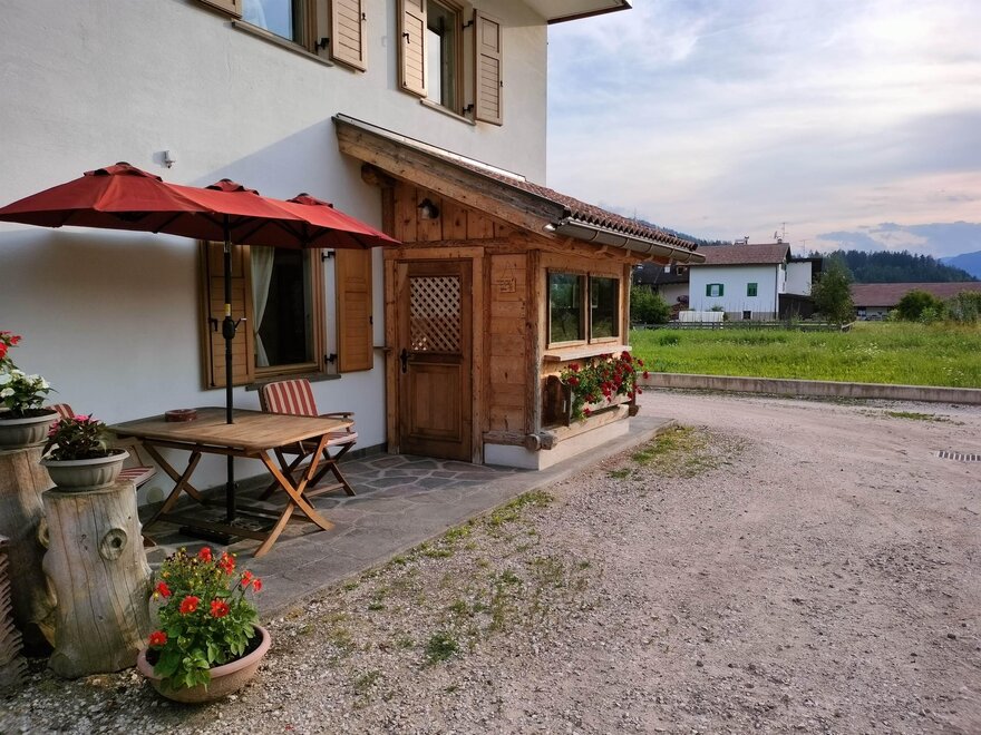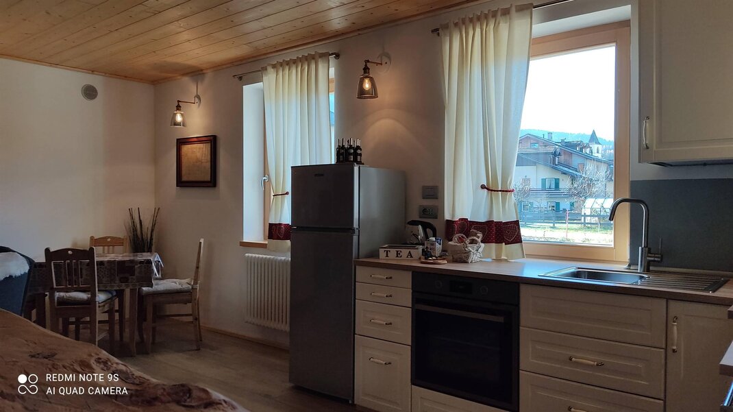 Schönes 39 Quadratmeter großes Studio-Apartment mit Wohnküche, Schlafzimmer mit Doppelbett und Bad mit Dusche, im Erdgeschoss, in ruhiger Lage in Masi di Cavalese.