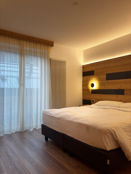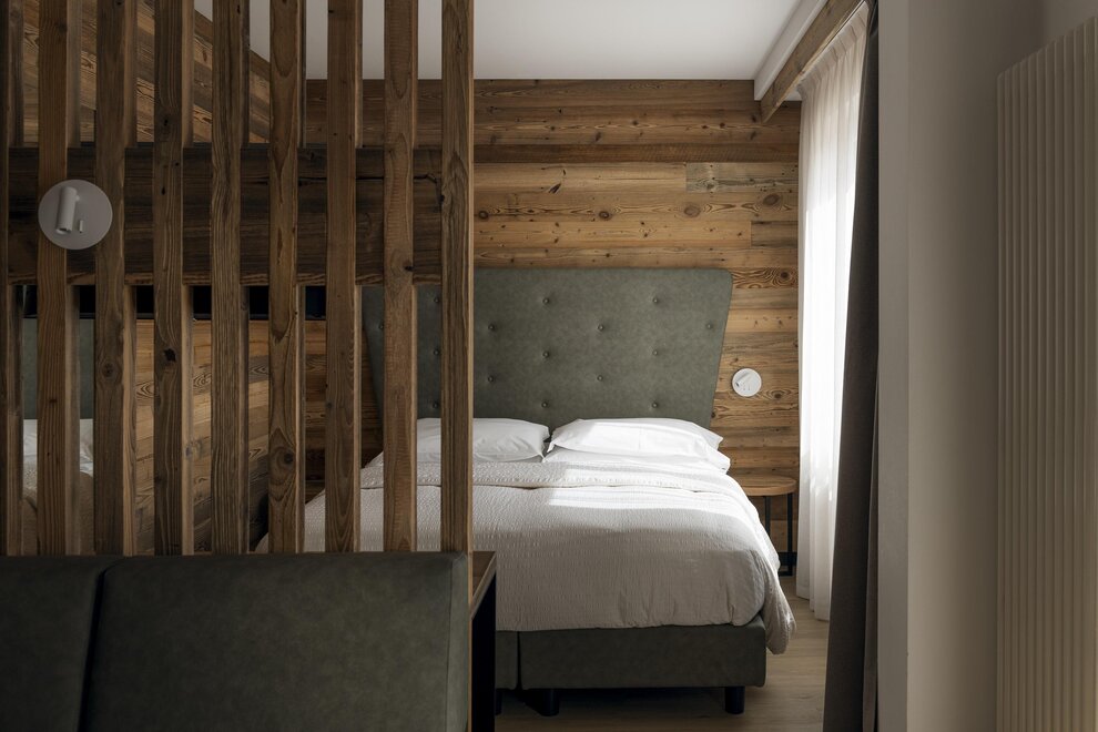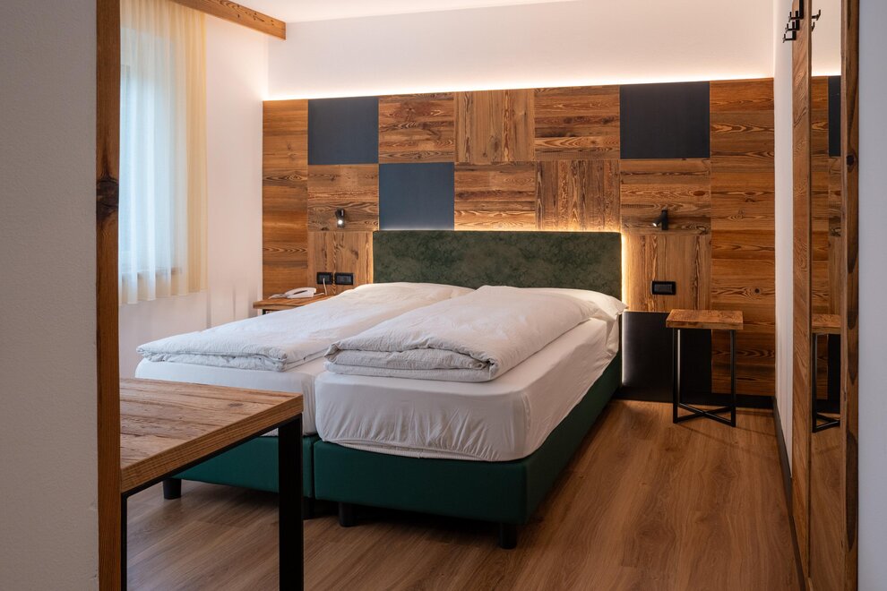 Essenzielle Eleganz und Komfort treffen in der Dolomiti-Zimmer aufeinander, die mit Lärchenholz und alpinen Details ausgestattet ist. Der Holzboden trägt zu einer warmen und raffinierten Atmosphäre bei. Der Balkon bietet einen angenehmen Blick auf die Berge, perfekt, um den Tag zu beginnen oder beim Sonnenuntergang zu entspannen. Es verfügt auch über einen geräumigen Kleiderschrank, der für längere Aufenthalte gedacht ist, ein Badezimmer mit Dusche, TV, Safe und kostenloses WLAN. Auf Anfrage sind Einzelbetten erhältlich.
