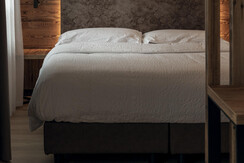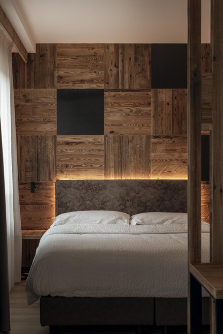 Hellig und einladend, verbindet die Panorama Superior den Charme des alpinen Stils mit modernen und eleganten Details. Der Boden aus Naturholz und die Möbel aus recyceltem Holz alter Berghütten schaffen eine authentische und eindrucksvolle Atmosphäre. Der Balkon bietet einen Blick auf die Piazza Brenta Alta und den Monte Spinale und bietet zu jeder Tageszeit spektakuläre Ausblicke. Perfekt für alle, die einen charmanten Aufenthalt im Herzen von Madonna di Campiglio wünschen.