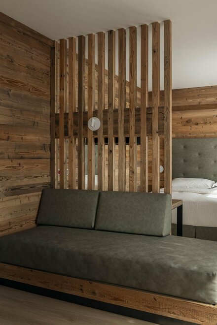 Das Junior-Zimmer ist eine ideale Lösung für Familien oder kleine Gruppen. Es besteht aus einem Doppelzimmer und einem zweiten, damit verbundenen Zimmer mit zwei Einzelbetten und bietet viel Platz und Komfort. Beide Zimmer sind im alpinen Stil eingerichtet und ausgestattet mit einem Kleiderschrank, einem Schreibtisch und einem Fernseher. Sie teilen sich ein geräumiges Bad. Auf Anfrage kann ein fünftes Bett oder ein Kinderbett im Doppelzimmer hinzugefügt werden.