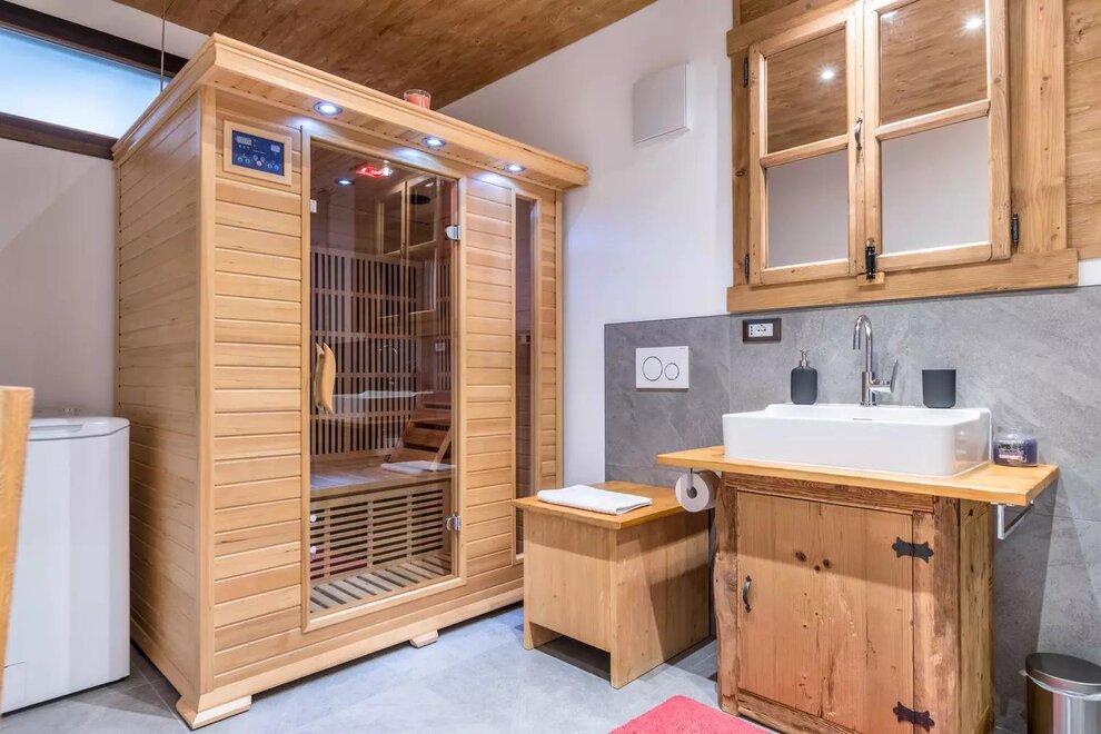 Sie verfügt über zwei Doppelzimmer und ein weiteres Doppelzimmer oder Zweibettzimmer mit einem Hochbett, alle mit Lärchenfußboden und autonomer Fußbodenheizung; jedes wurde auf originelle Weise von Marco, dem Eigentümer, eingerichtet. Es gibt zwei Badezimmer mit Duschen, Waschmaschine und das größere bietet eine Überraschung: die Infrarotsauna für zwei Personen.
