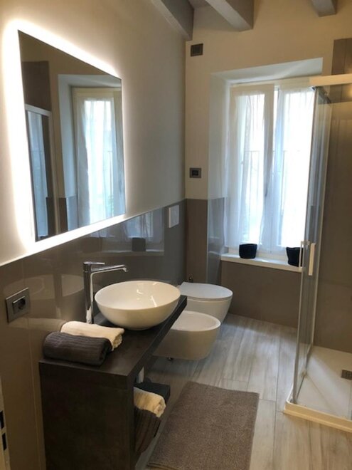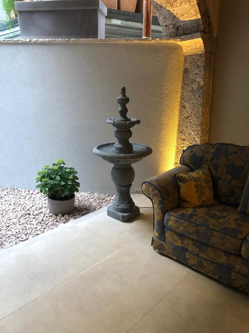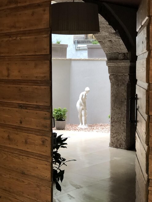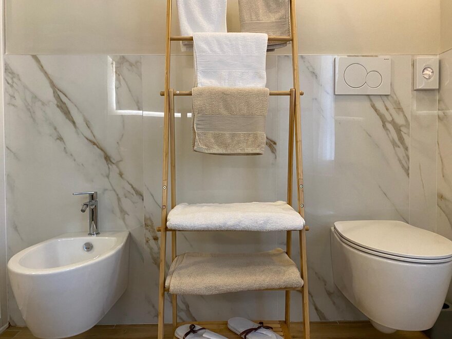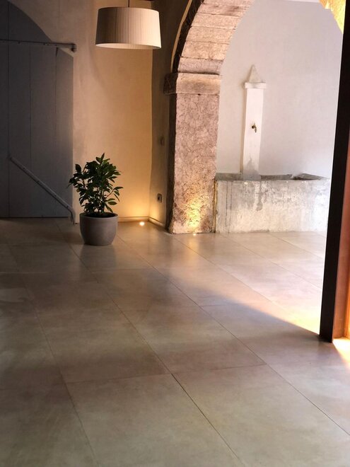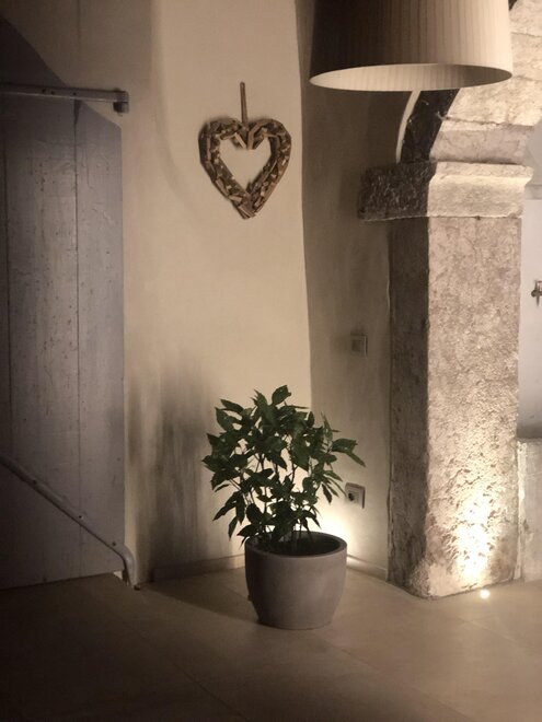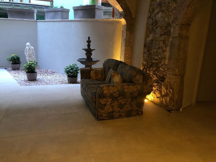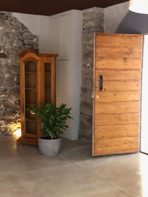In den 1950er Jahren von ihrer Großmutter gekauft, wurde es komplett renoviert, mit dem Wunsch, einige Originalteile des Hauses zu erhalten, wie die rosa Marmorbögen im Innenhof, die Tonnengewölbe im Saunabereich, die Steine entlang der Innentreppe kombiniert mit modernen Apartments., geräumig, hell, mit geweißter Holzbalkendecke, Bäder aus Carrara-Marmor, mit Liebe zum Detail eingerichtet.