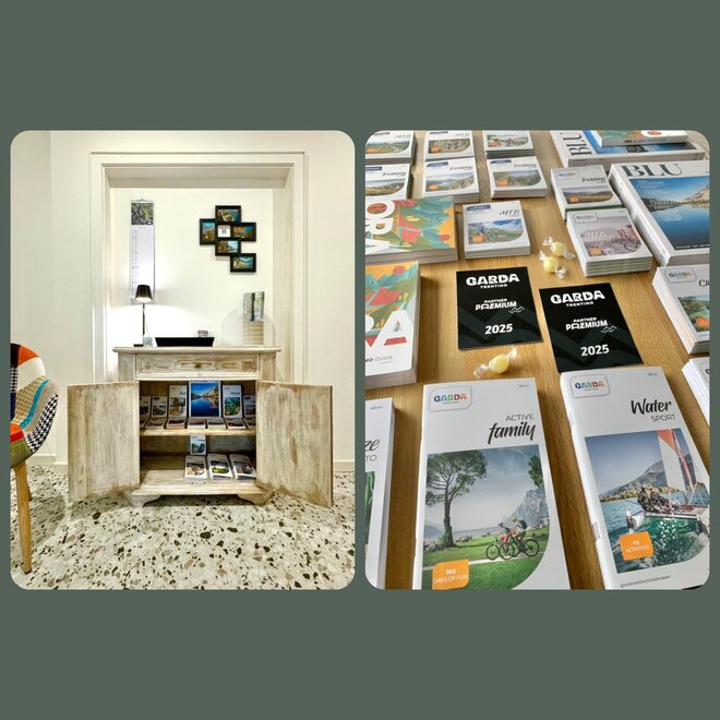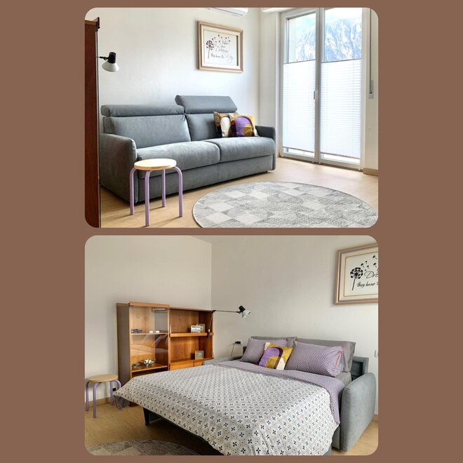 Dieses ruhige Dreizimmer-Appartement im zweiten Stockwerk ist nach Süd-Westen ausgerichtet und hat einige Originalelemente der 70er Jahre – moderne Antiquitäten und Bilder – bewahrt, die im Inneren eine unerwartete Boho Chic - Atmosphäre erzeugen. Die Farben, die an das Blau und Grün des Gardasees erinnern, und der Blick auf die Landschaft ringsherum machen es ideal für einen gemütlichen und entspannten Aufenthalt.
