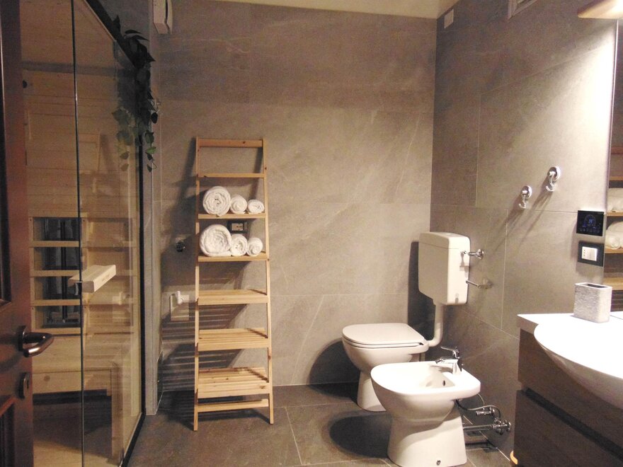Das moderne Badezimmer verfügt über eine private Infrarotsauna, für Entspannungsmomente zu jeder Jahreszeit.
