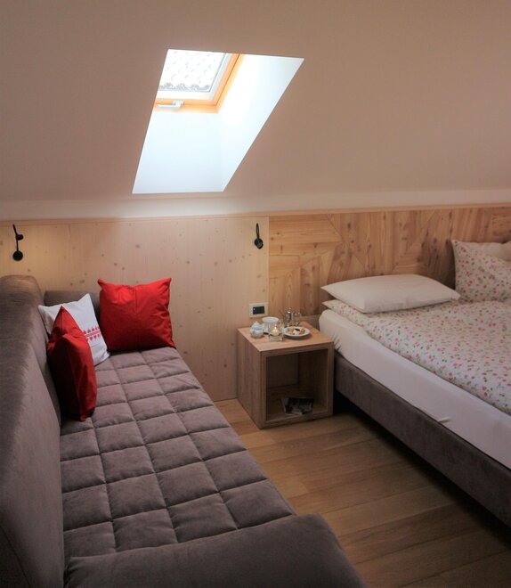 Großes Panoramazimmer im grünen Val di Femme. Geeignet für Familien oder Paare, die mehr Platz genießen möchten. Es verfügt über 1 Doppelbett (oder zwei Einzelbetten auf Anfrage) und 1 Doppelschlafsofa. Es verfügt über ein eigenes Bad mit WC, Dusche und Bidet.