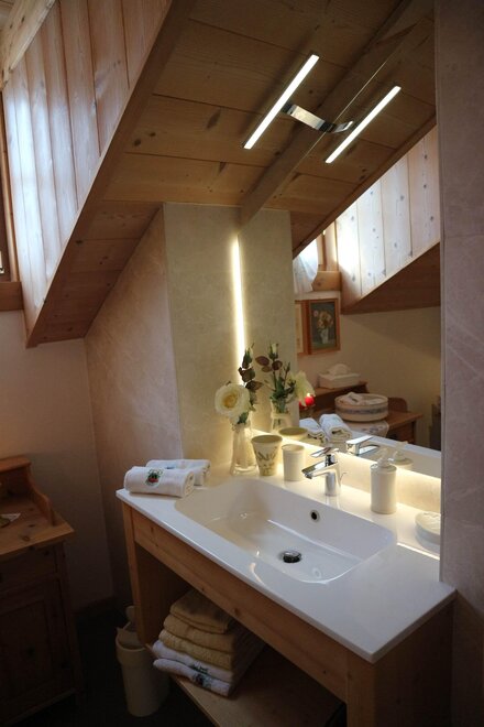 Doppel- oder Dreibettzimmer mit Panoramablick im Val di Fiemme. Es verfügt über 1 Doppelbett (oder zwei Einzelbetten auf Anfrage) und 1 Einzelschlafsofa. Es verfügt über ein eigenes Bad mit WC, Dusche und Bidet.
