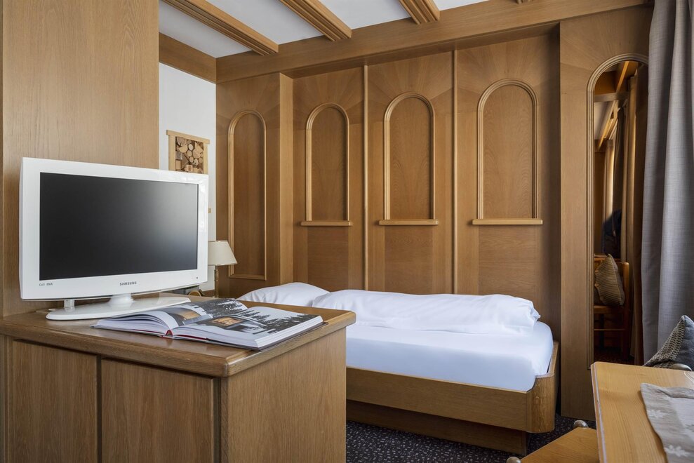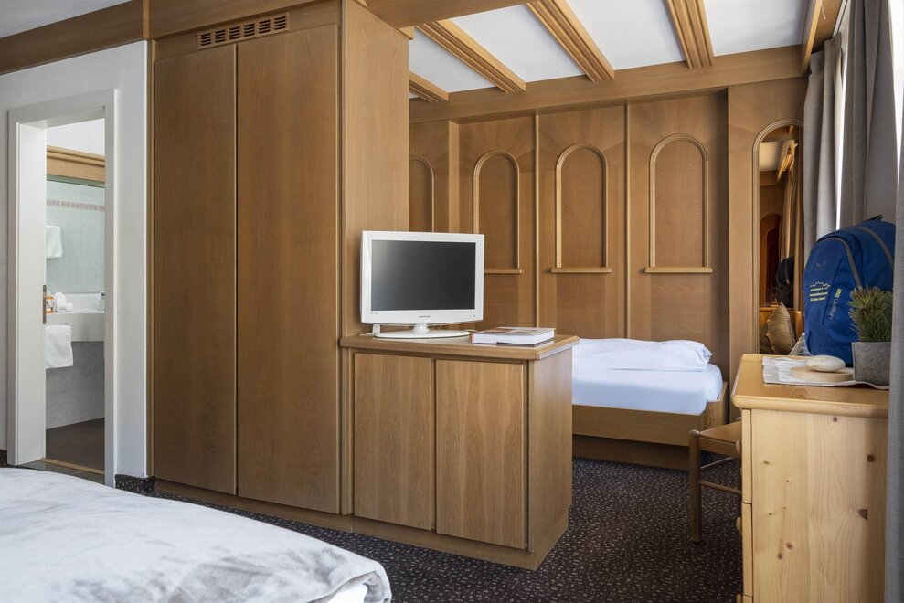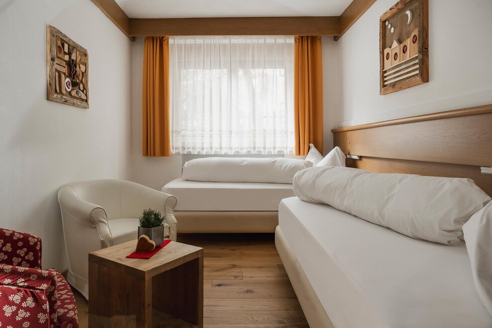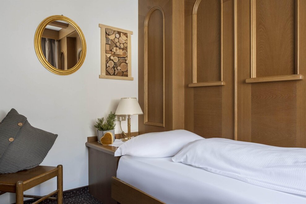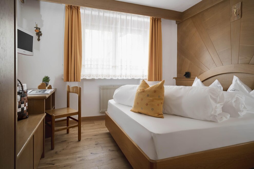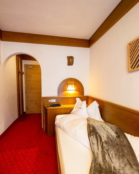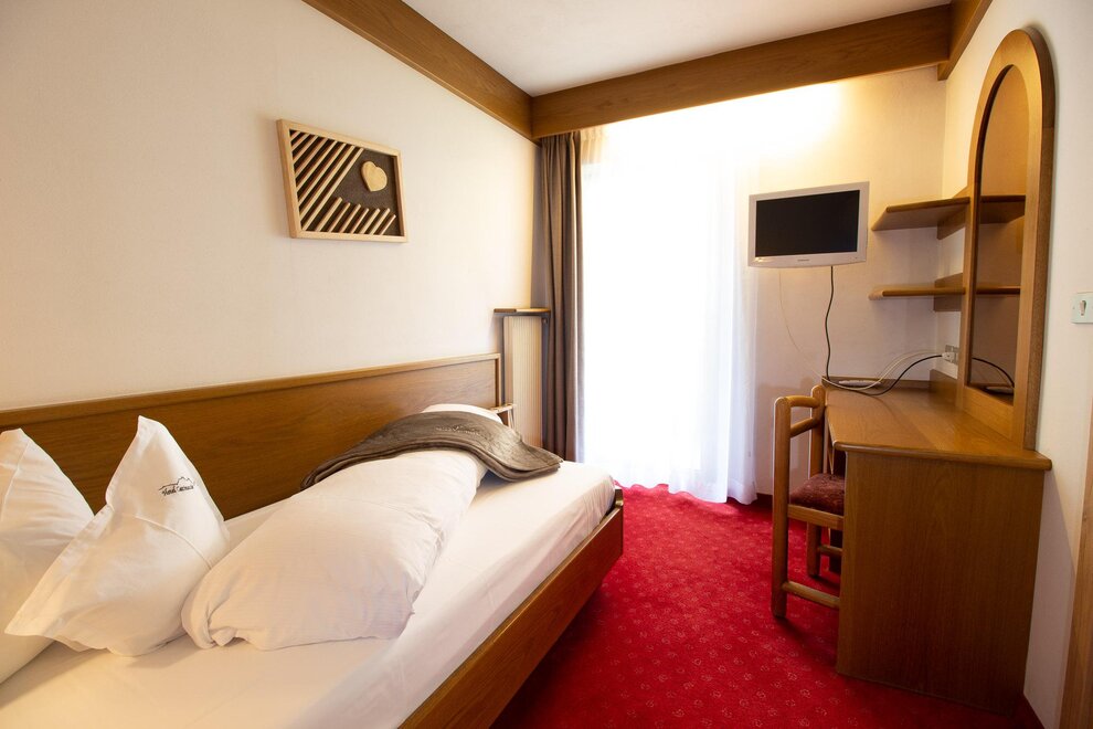 Bei warmem Holz mit Details erinnern an die ladinische Kultur, Das Zimmer hat ein Einzelbett, Sat-TV, Balkon, Telefon, Safe, Bad mit Dusche, Haartrockner und Pflegeprodukten. Befindet sich auf der Rückseite des Hotels, jeden Morgen können Sie aufwachen, um das Zwitschern der Vögel und genießen Sie den Blick auf den Rosengarten und Mugoni.