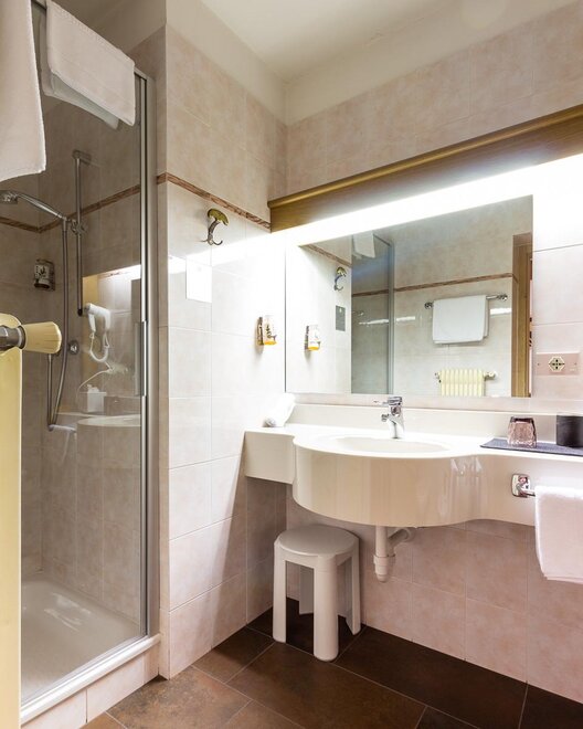 Die Wahl der klassischen Zimmer Sie 20 Quadratmeter, zart duftend aus unserer Tradition haben werde. Auf der Vorderseite des Hotels, jeden Morgen wacht man mit der Sonne im Zimmer und genießen Sie den Blick auf die Marmolada, Langkofel, Pordoi und der Top Zwölf.