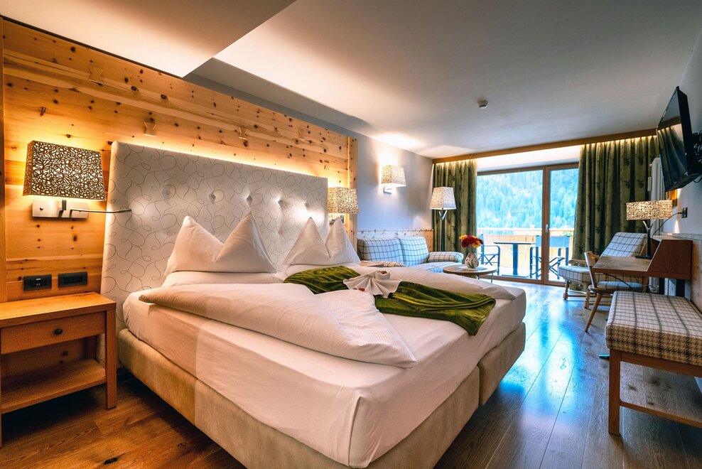 Neue Zimmer mit ca. 45 qm. mit rundem Bett, Holzboden, Balkon zur Westseite. Die Suite Antermoia ist eine Erkersuite mit herrlichem Ausblick. Die Suites, verfügen über einen großen HD-Flachbild Tv mit Satellitenprogrammen, Telefon, Tresor, Mini-Kühlschrank, Wasserkocher mit Teesortiment und Elektro-Kamin. Das Bad hat eine geräumige Dusche, Badewanne und auch eine Infrarot Kabine; WC und Bidet sind vom Bad getrennt.