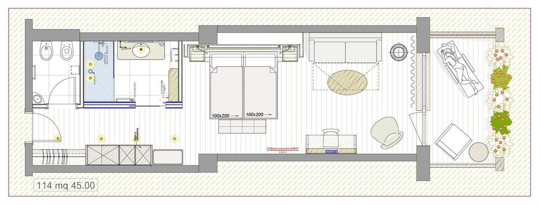 Das Bad hat eine geräumige Dusche und auch eine Infrarot Kabine; WC und Bidet sind vom Bad getrennt.Ausstattung Zimmer/Appartement