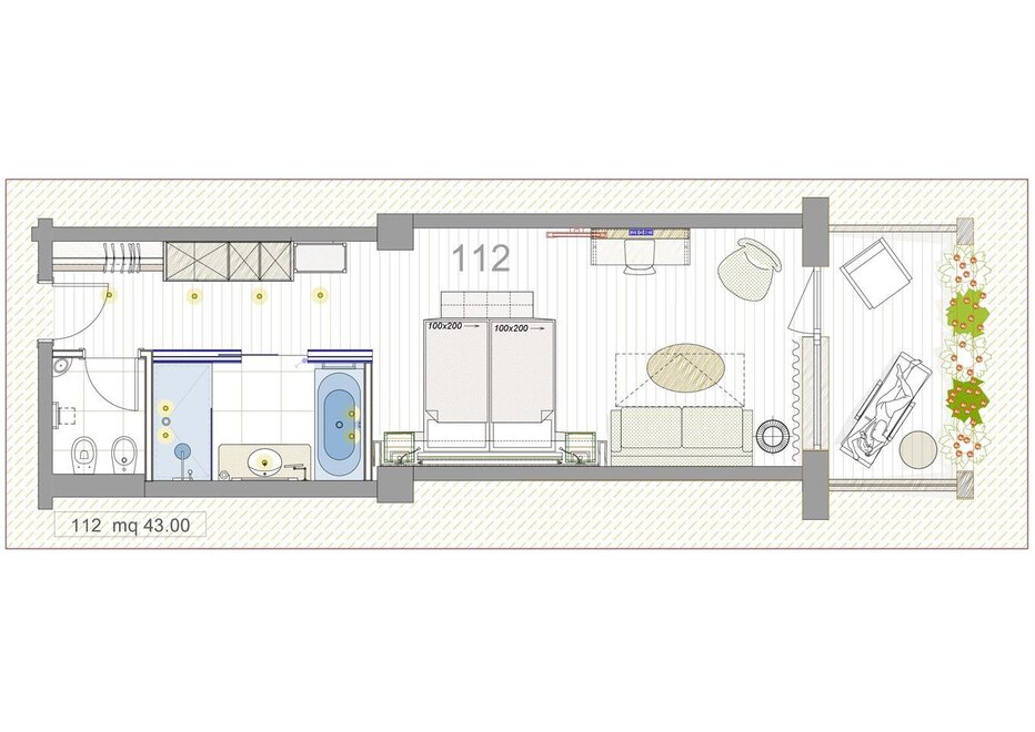 Das Bad hat eine geräumige Dusche, Badewanne und auch eine Infrarot Kabine; WC und Bidet sind vom Bad getrennt.Neue Zimmer mit ca. 55 qm. mit rundem Bett, mit grossem Balkon zur Südseite.