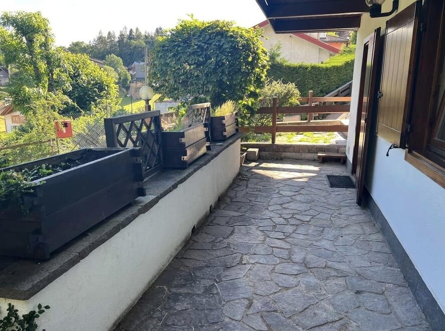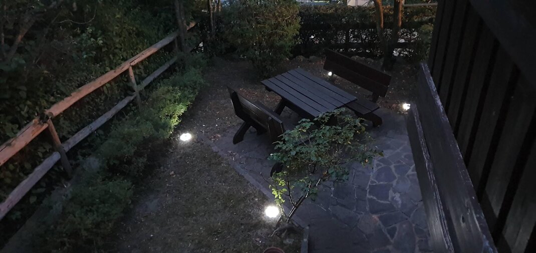 Im Außenbereich befindet sich ein schöner privater Garten mit Blumenkästen, der durch eine hübsche Ecke mit Holztisch und Bänken ergänzt wird, ideal für Momente der Entspannung im Freien.