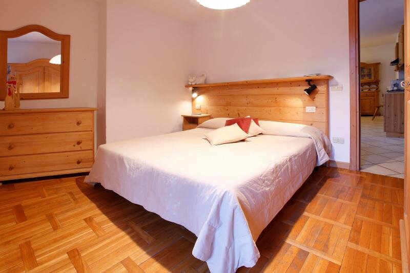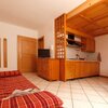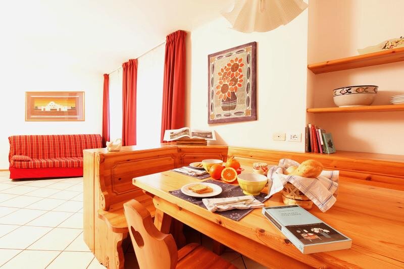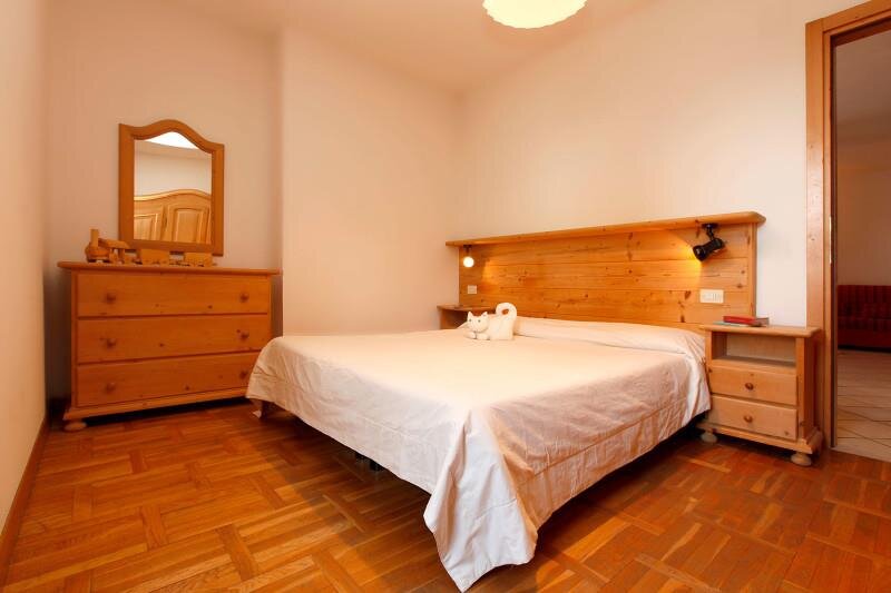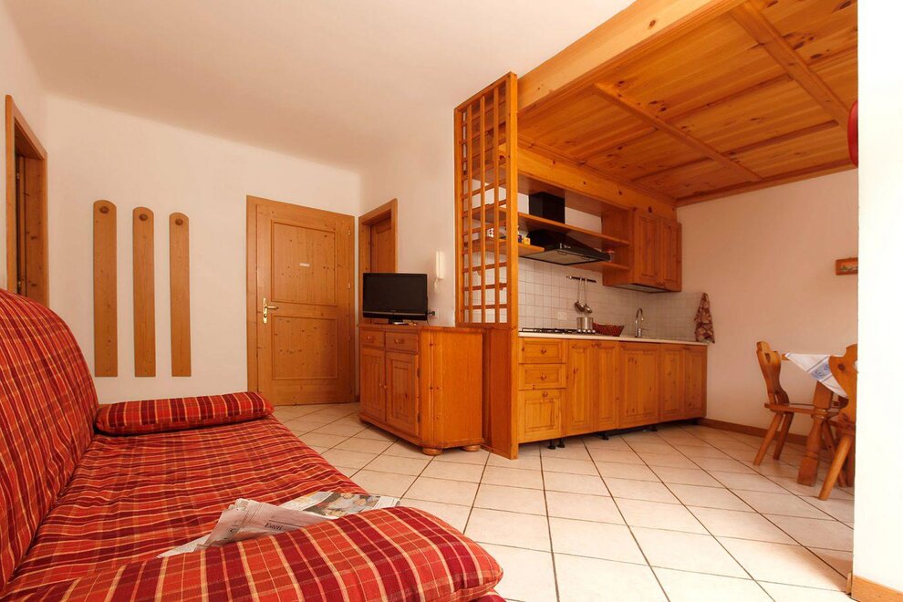 Gemütliche und warme Zwei-Zimmer-Wohnung mit 4/5 Schlafplätzen, gelegen im zweiten Stock, bestehend aus Wohnzimmer mit Kochnische, Rundbank, Doppel-Schlafsofa, direktem Zugang zur privaten Terrasse mit kleinem Garten, ausgestattet mit Tisch und Stühlen; Schlafzimmer, plus einzelner Schlafsessel. Bad mit Waschbecken, WC, Bidet und Duschkabine.
