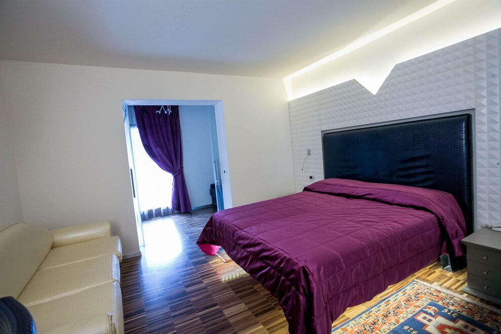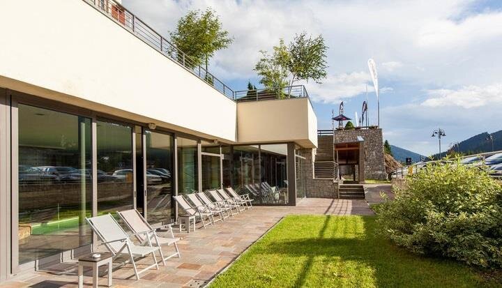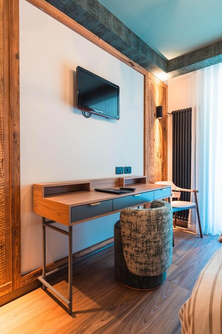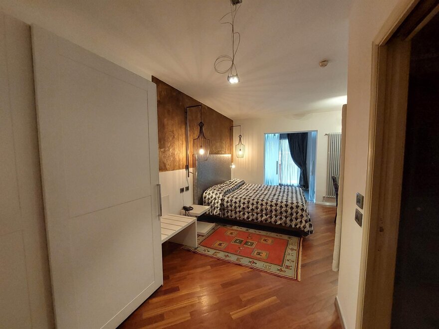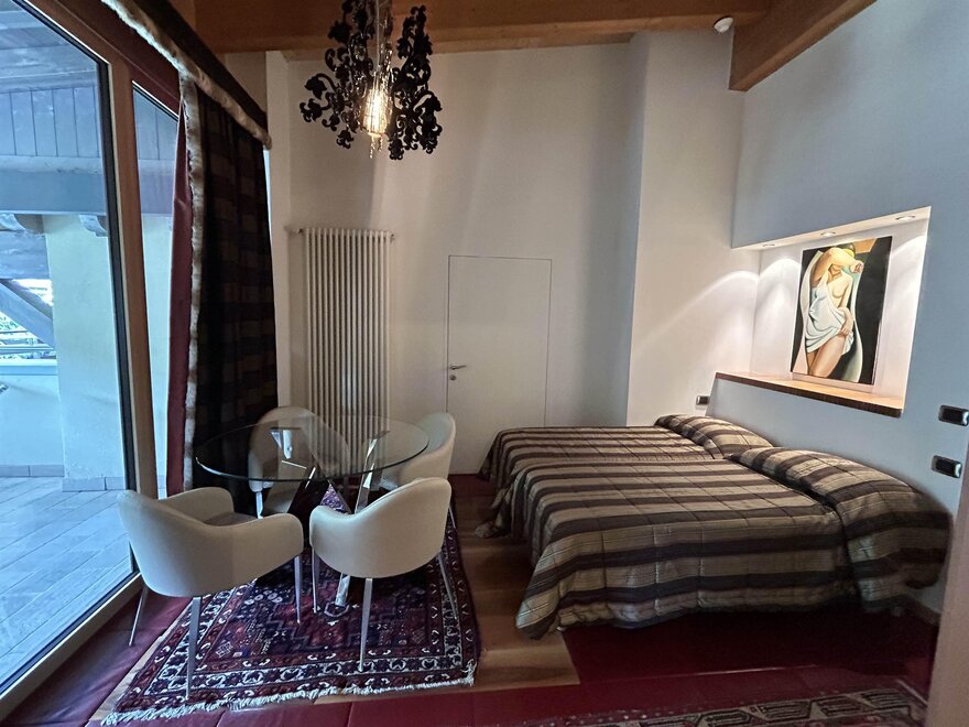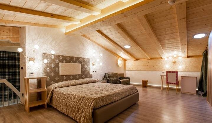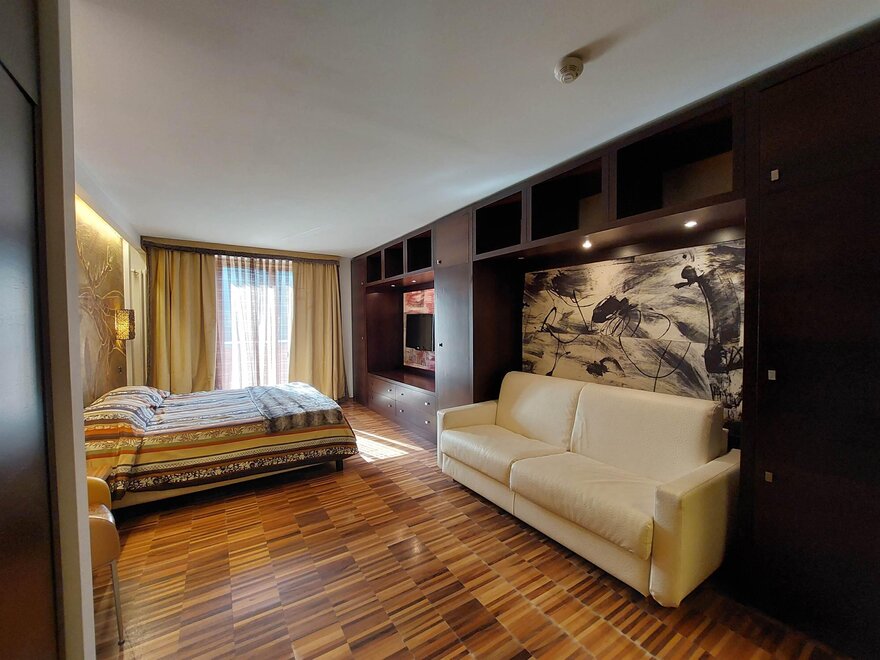 Geräumig, ausgestattet mit eleganten Möbeln, Holzparkett, TV, WLAN, Telefon, Minibar, Safe, ausgestattetem Bad, Dusche/Whirlpool, Spa-Set, Sitzecke, Panoramaterrasse mit Blick auf Madonna di Campiglio. Sie können auch miteinander verbunden sein. Notabene: Die Flächen beinhalten das Zimmer und das Bad. Die Fotos dienen als Beispiel. (Es gibt verschiedene Typen und unterschiedliche Einrichtungsstile)