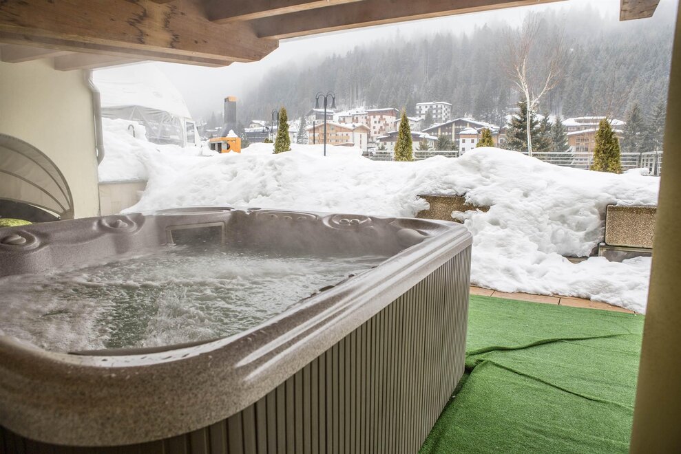 Geräumige, elegante Möbel, Holzboden, WLAN-Internetzugang, Wi-Fi, Telefon, Minibar, Safe, geräumige und gut ausgestattetes Badezimmer , mit Musik geleitet Whirlpool-Badewanne, Bademantel, Sitzecke, Terrasse und Panoramablick über die Ortschaft von Madonna di Campiglio