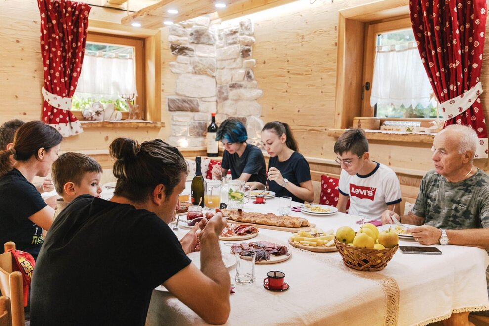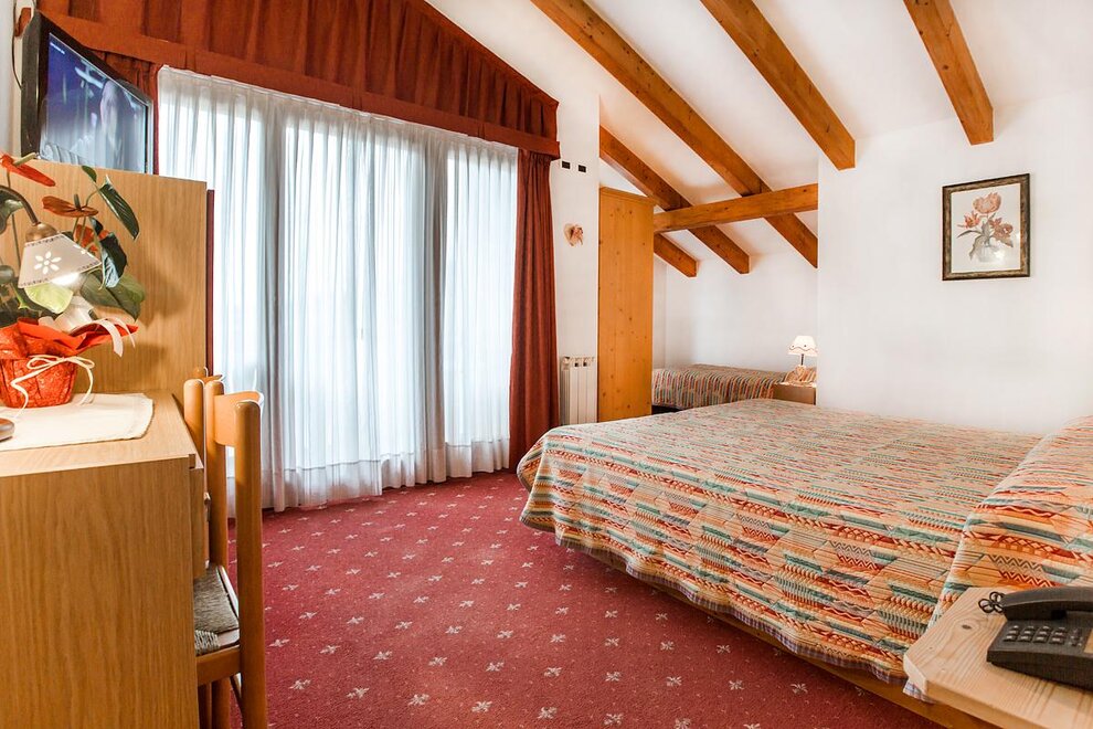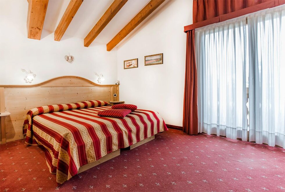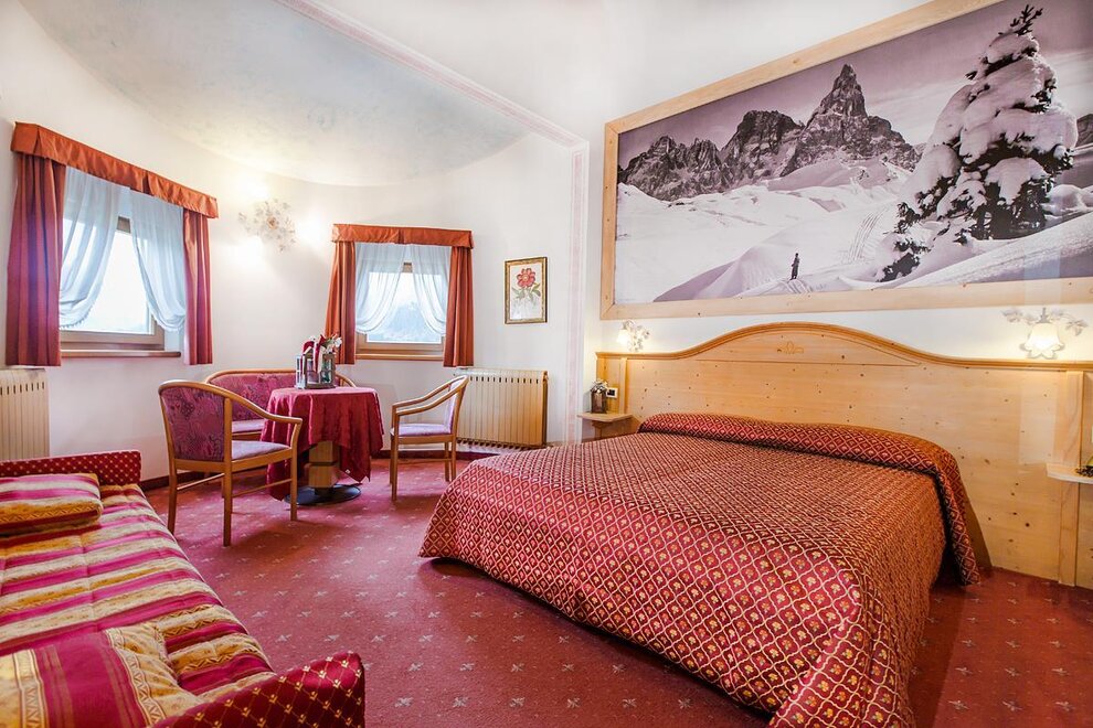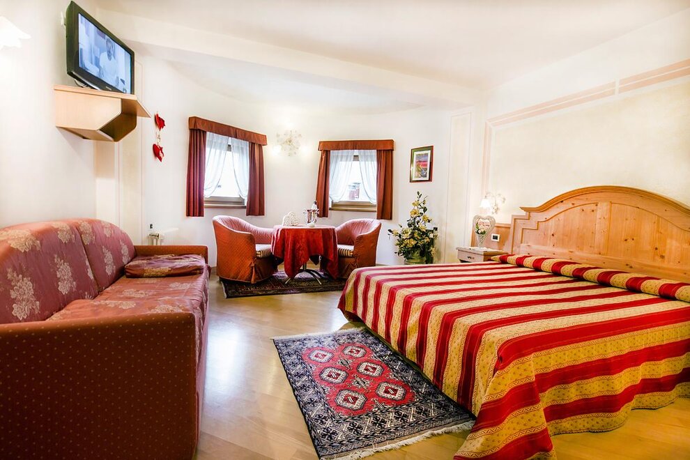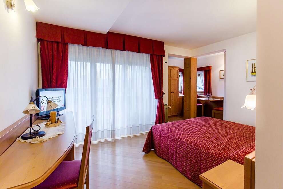 Die Familienzimmer sind die geräumigsten und haben eine besonders einladende Umgebung: einige haben Holzböden und andere Teppichböden, eine Sitzecke mit Sofa und einen Panoramablick auf die Pale di San Martino.