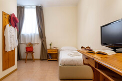 FAMILIENZIMMER 25 M²: gemütlich und geräumig, in rustikalem Stil eingerichtet, ideal für 3-4 Personen, sonniger Balkon mit schöner Aussicht, Bad mit Dusche, Klimaanlage, Satelliten-Fernsehen, Telefon und mit Aufzug erreichbar.