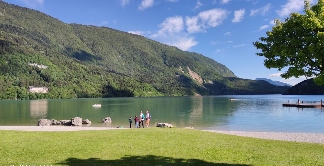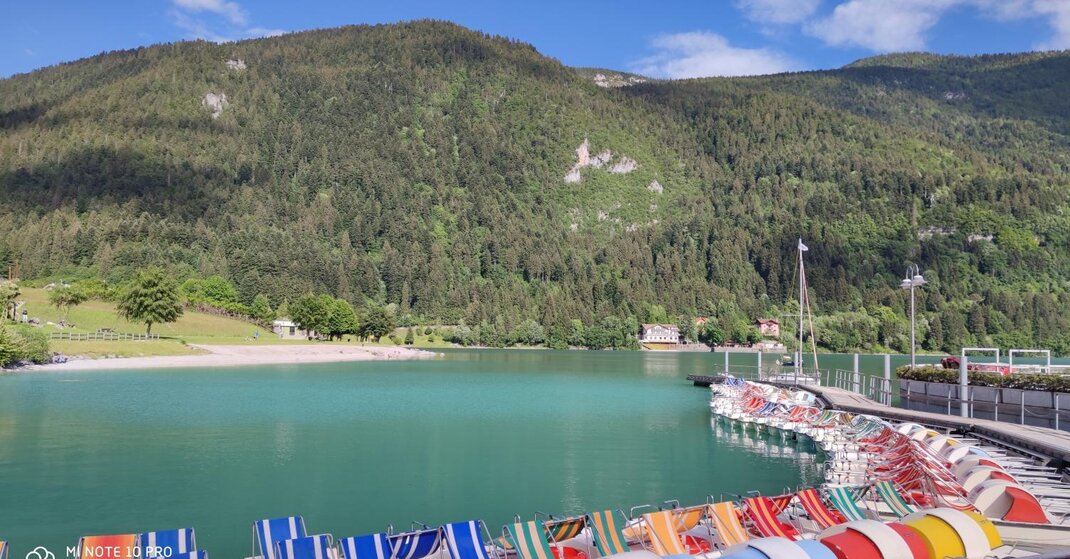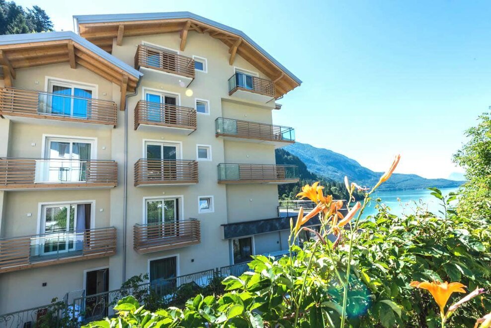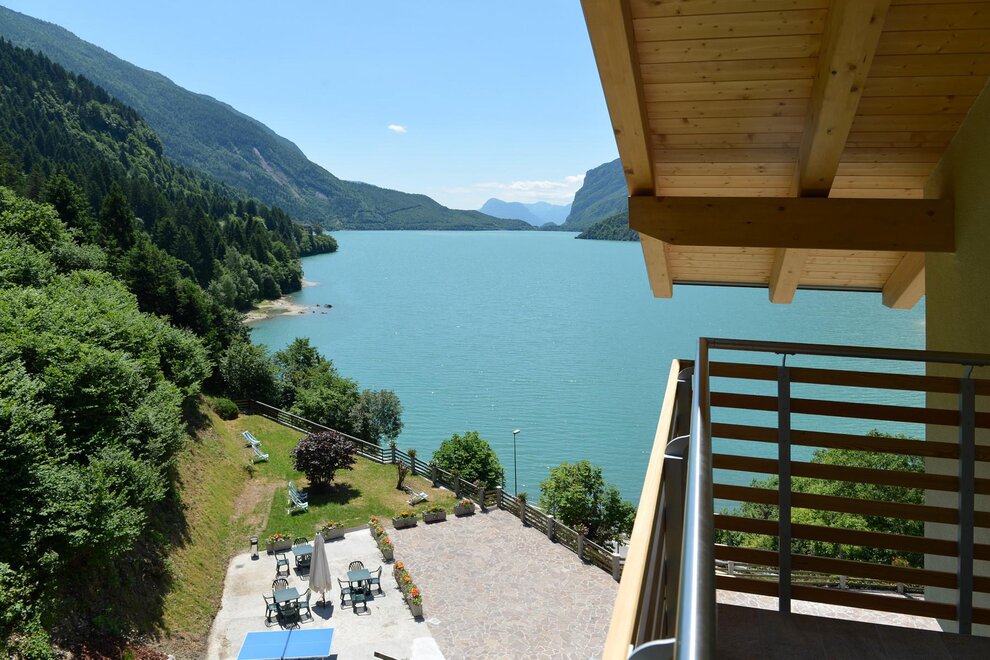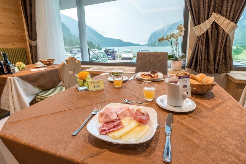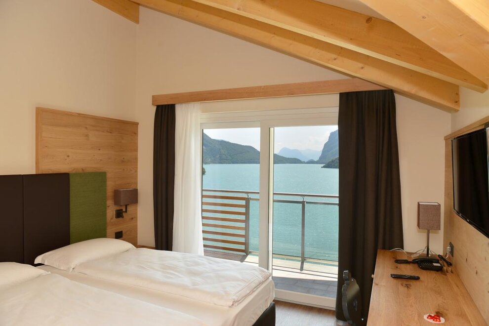 Tannenholz mit KnotenUm von Sonnenaufgang bis Sonnenuntergang auf dem See Molveno genießen!Möbliert in Tanne mit Parkettboden, unsere geräumigsten Zimmer, alle mit Sofa-Bett, alle mit Balkon und herrlichem Seeblick.
