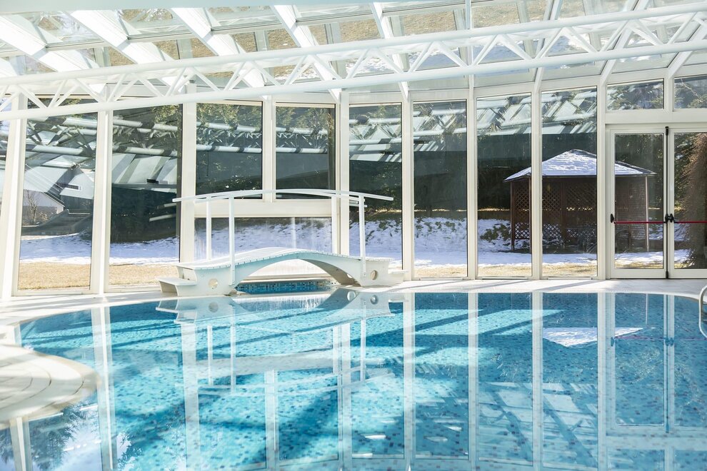 Ein Wellnesshotel mit Innenpool, Sauna, Fitnessraum und Außenbereich. Behandlungen auf Anfrage.