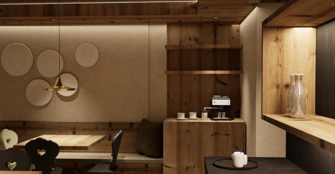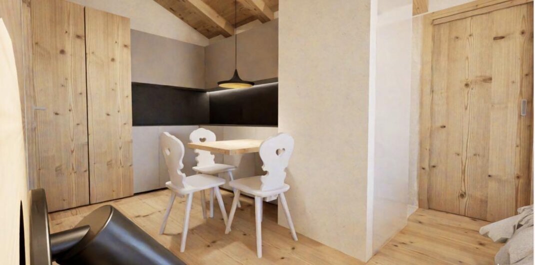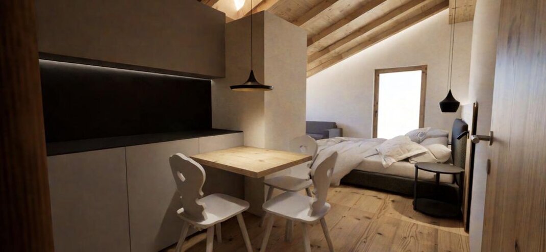 Mit einer Fichtenverkleidung vermittelt dieses Zimmer ein Gefühl von Frische und Ruhe. Es ist für diejenigen gedacht, die einfache und ordentliche Räume schätzen, mit Designelementen, die die Persönlichkeit unterstreichen. Ausgestattet mit einer praktischen Küchenzeile, bietet es Funktionalität und Komfort, ohne auf Ästhetik zu verzichten.